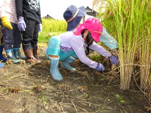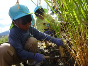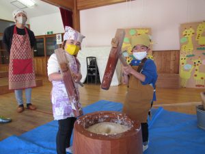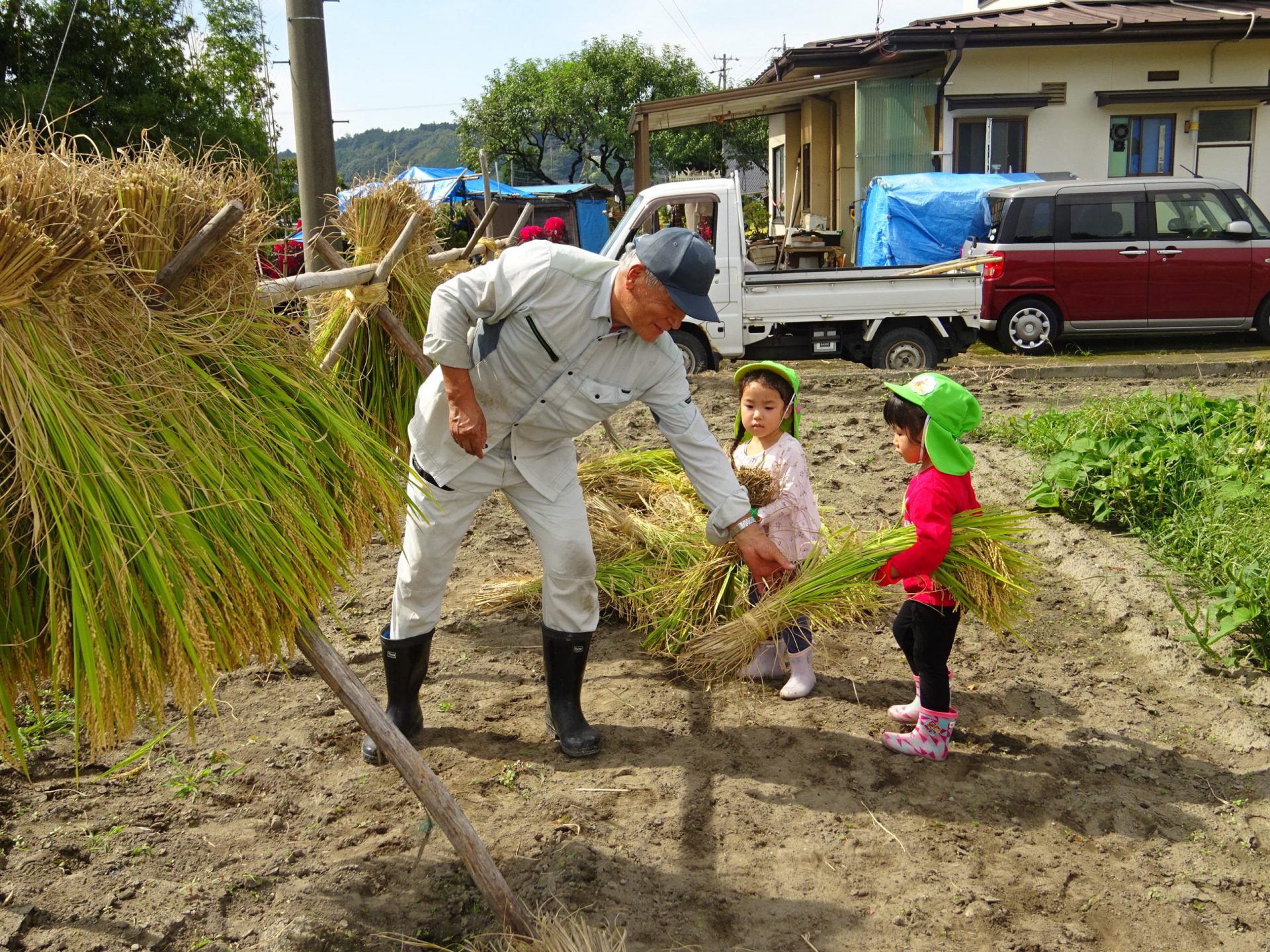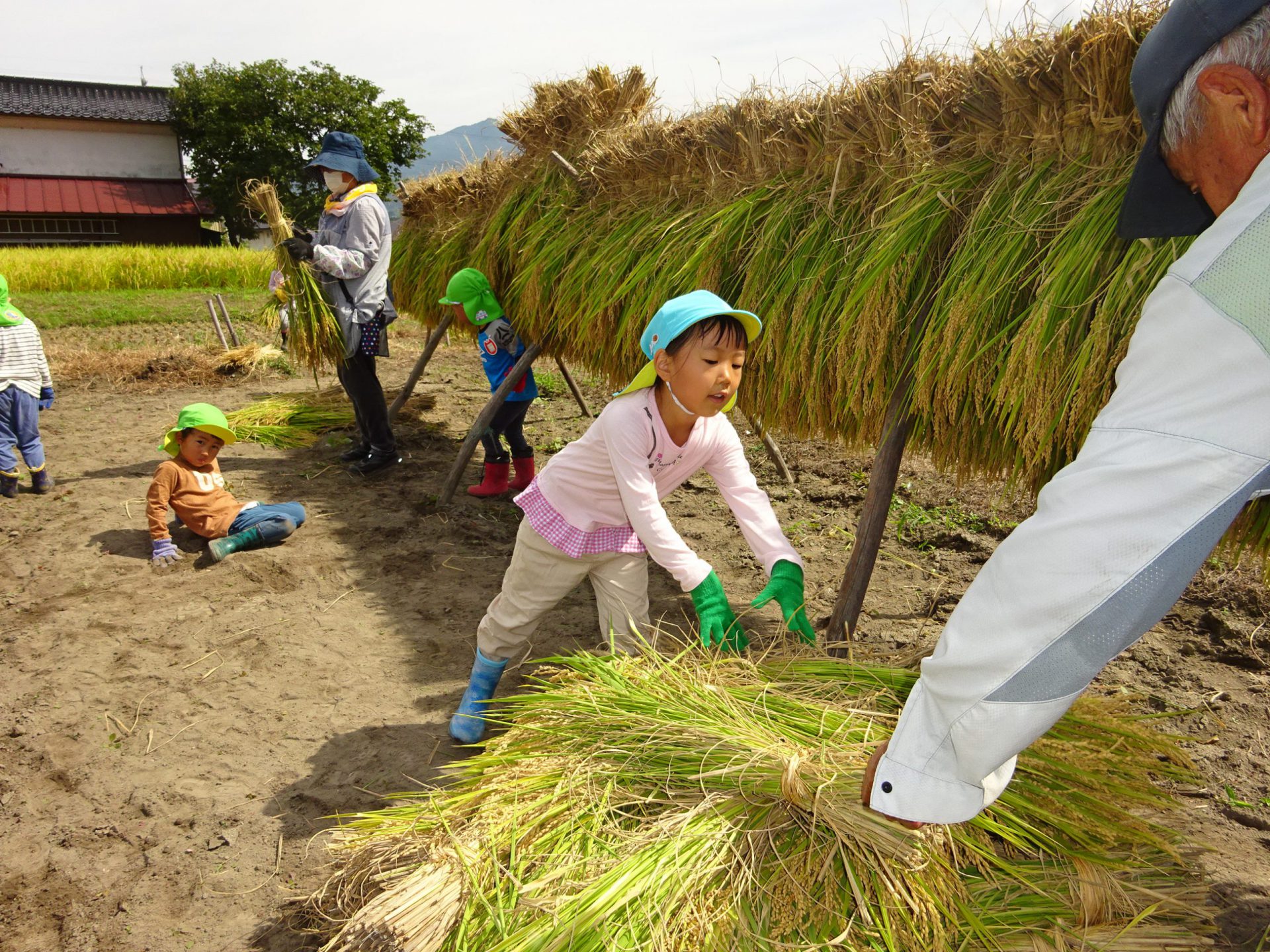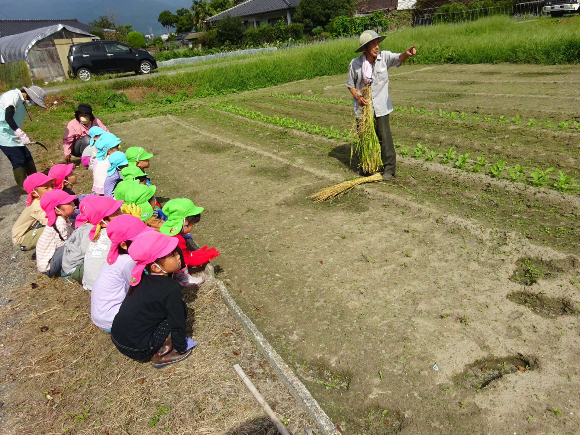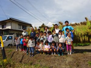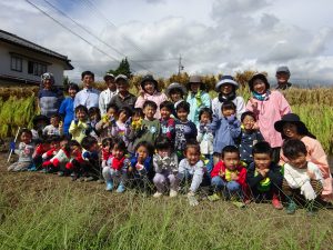 地域の方の協力を得ながら、畑や田んぼの活動をしています。春は田植え、秋は稲刈りやもちつき会といった田んぼの活動の他、畑でさまざまな野菜を育てて収穫しています。採った野菜は、園で調理して食べたり、お家へ持ち帰って食べたりと、食育につながっています。