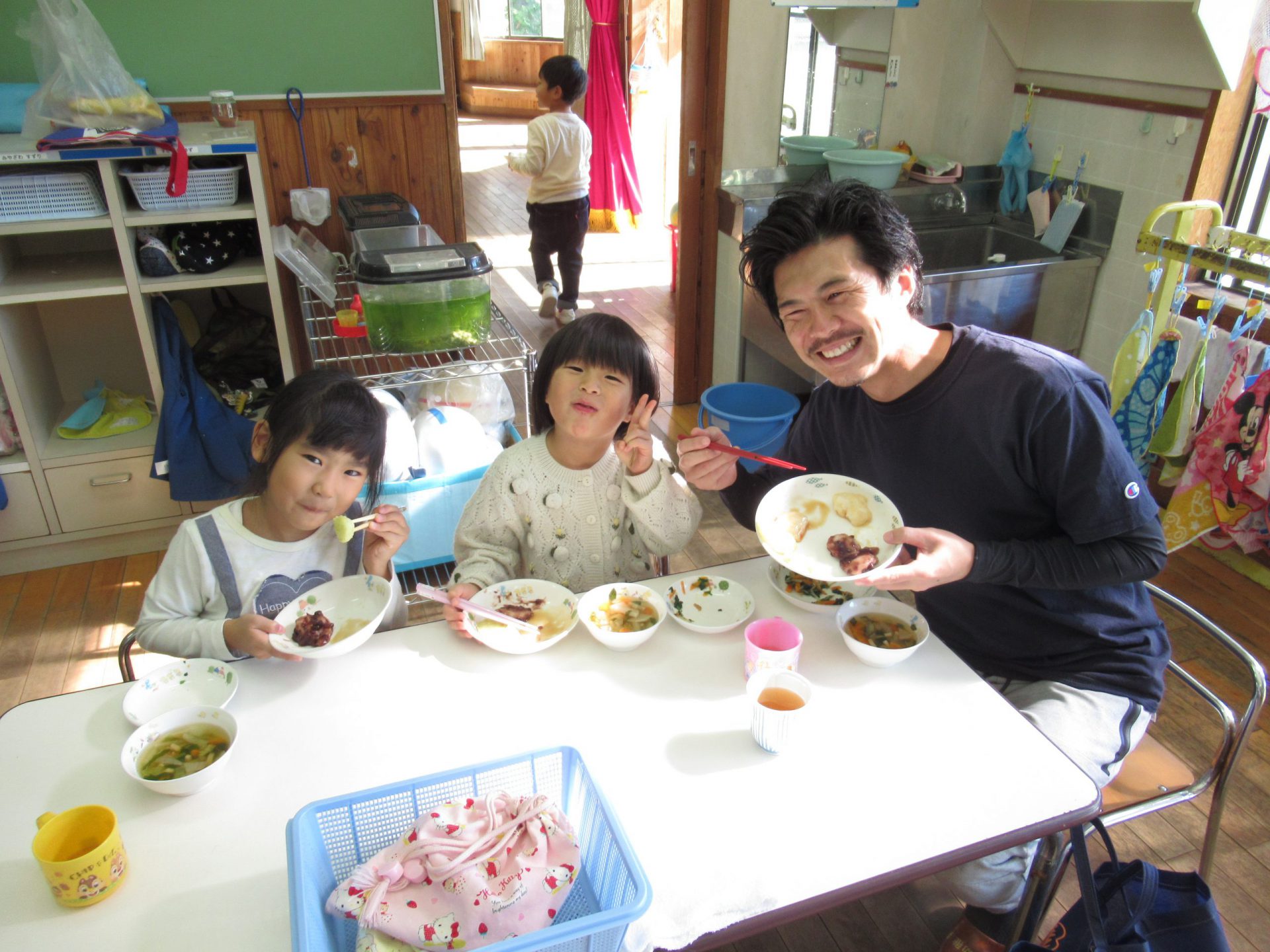 年中・年長さんはそこでお花見給食。「きれいだね!」「気持ちいいね!」「花びらが入った!!」などと言いながら、いつもとは違った雰囲気で給食を楽しむことができました。