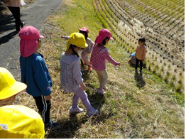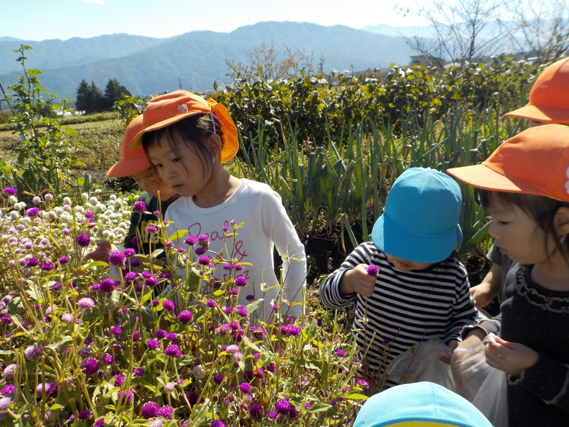 自然豊かな環境をいかし、野山に出かけ、自然の中で草花や木の実、虫たちに触れるなどして遊んでいます。