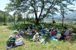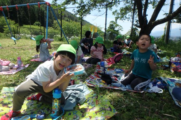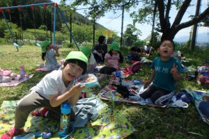 保護者の皆さんが作ってくれたお弁当。子ども達は保育園を出発する時から中身を教えあったり自慢しあっていました。公園へ向かう途中でも。公園に着いてからも。食事中も。