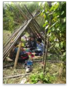 - 待っていた仲間と梅の木を柱に数本の竹を立て掛け、基地らしくなってきた。