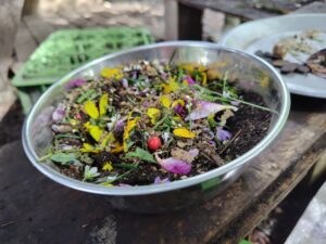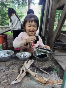 森の中で、おひさまの光、風、香り、火がはぜる音・・・など五感を働かせながら友だちと一緒に食事を囲むランチ時間も大切にしています。