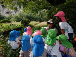 やまぼうし自然学校の講師の方々をお迎えして普段の散歩でよく行く緑地公園に行きました。みんなで何をして遊ぶのかな、どんな遊びを教えてもらえるのかな、と子ども達も保育士もワクワクしながら出発しました。