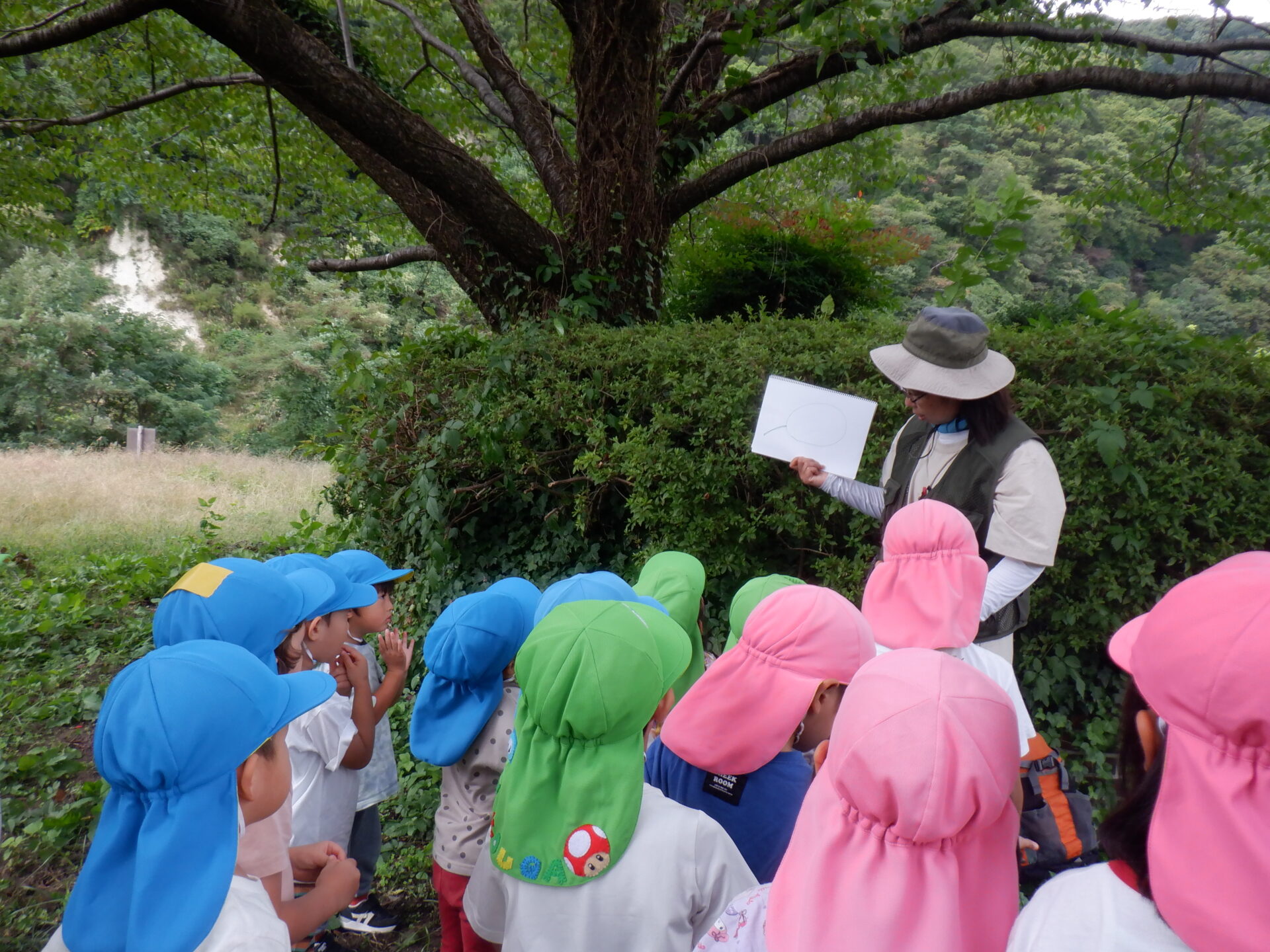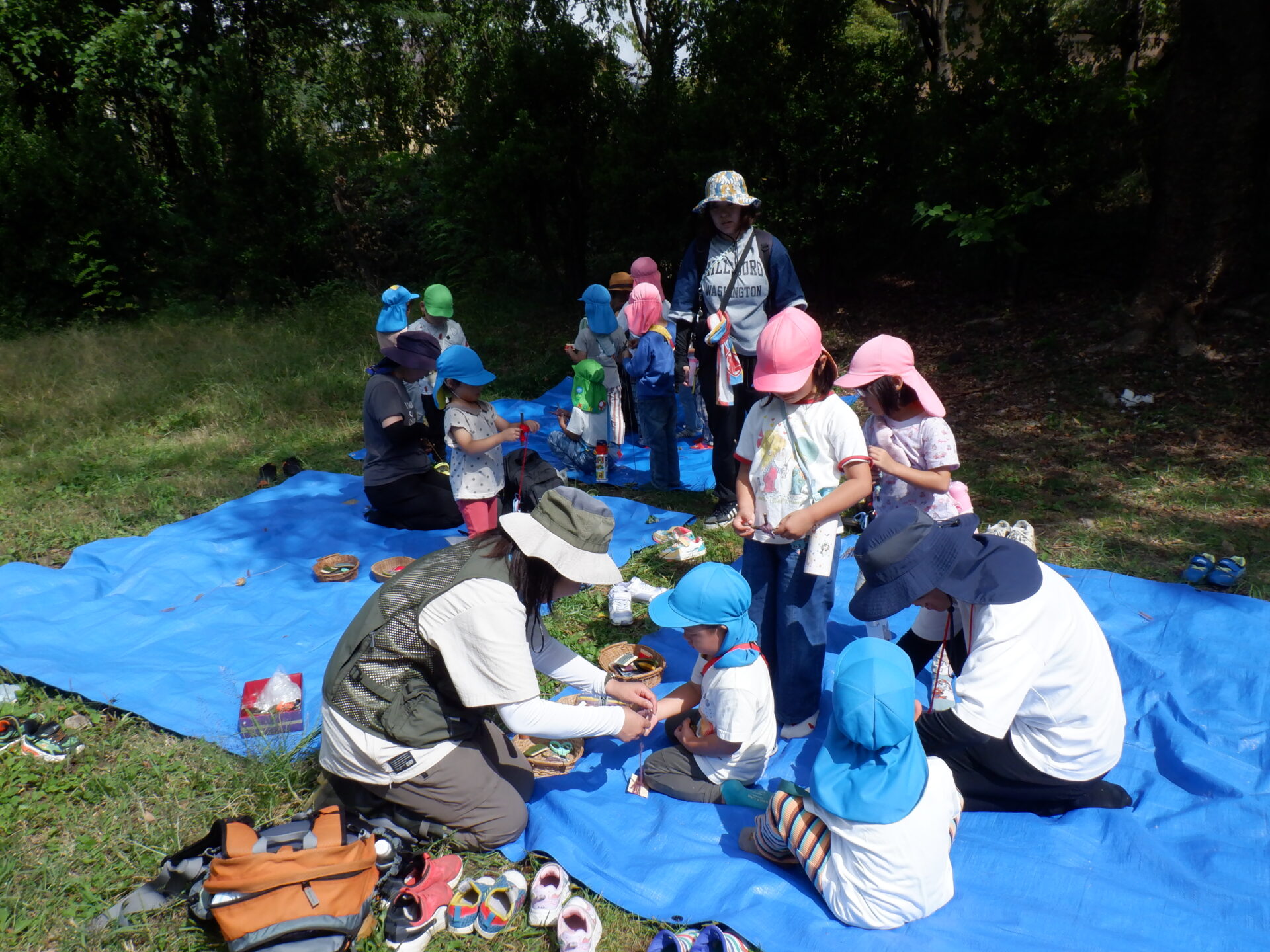 やまぼうし自然学校の講師の方々をお迎えして普段の散歩でよく行く緑地公園に行きました。みんなで何をして遊ぶのかな、どんな遊びを教えてもらえるのかな、と子ども達も保育士もワクワクしながら出発しました。