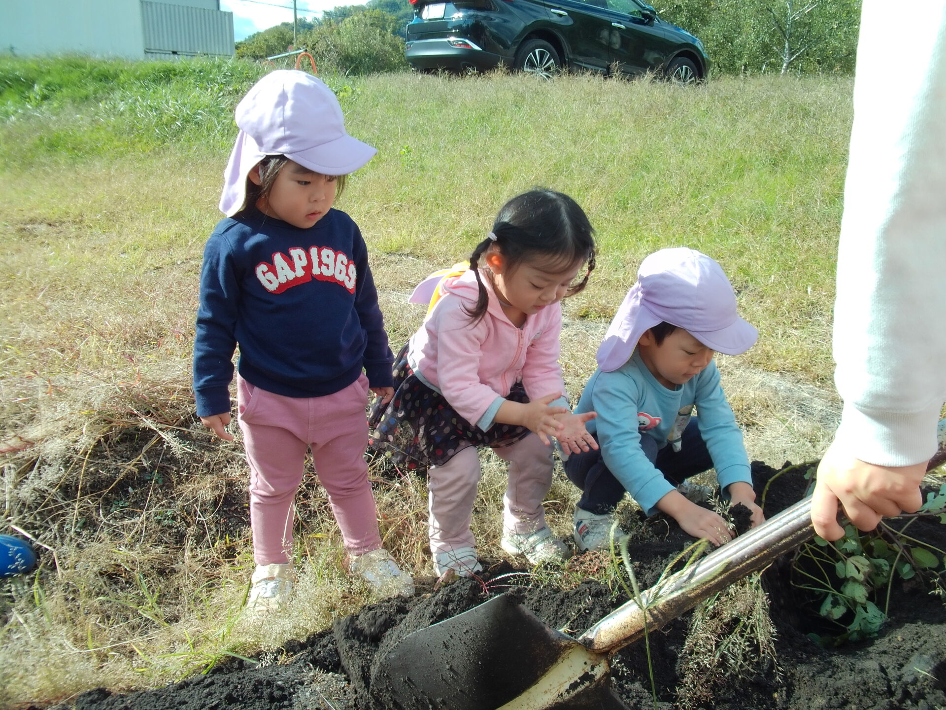 ・実は子ども達の「やってみたい!」を引き出したくて、ひまわり組が芋掘りをする時間に出かけました。自然なかたちで意欲が芽生える、とても良いきっかけになりました。