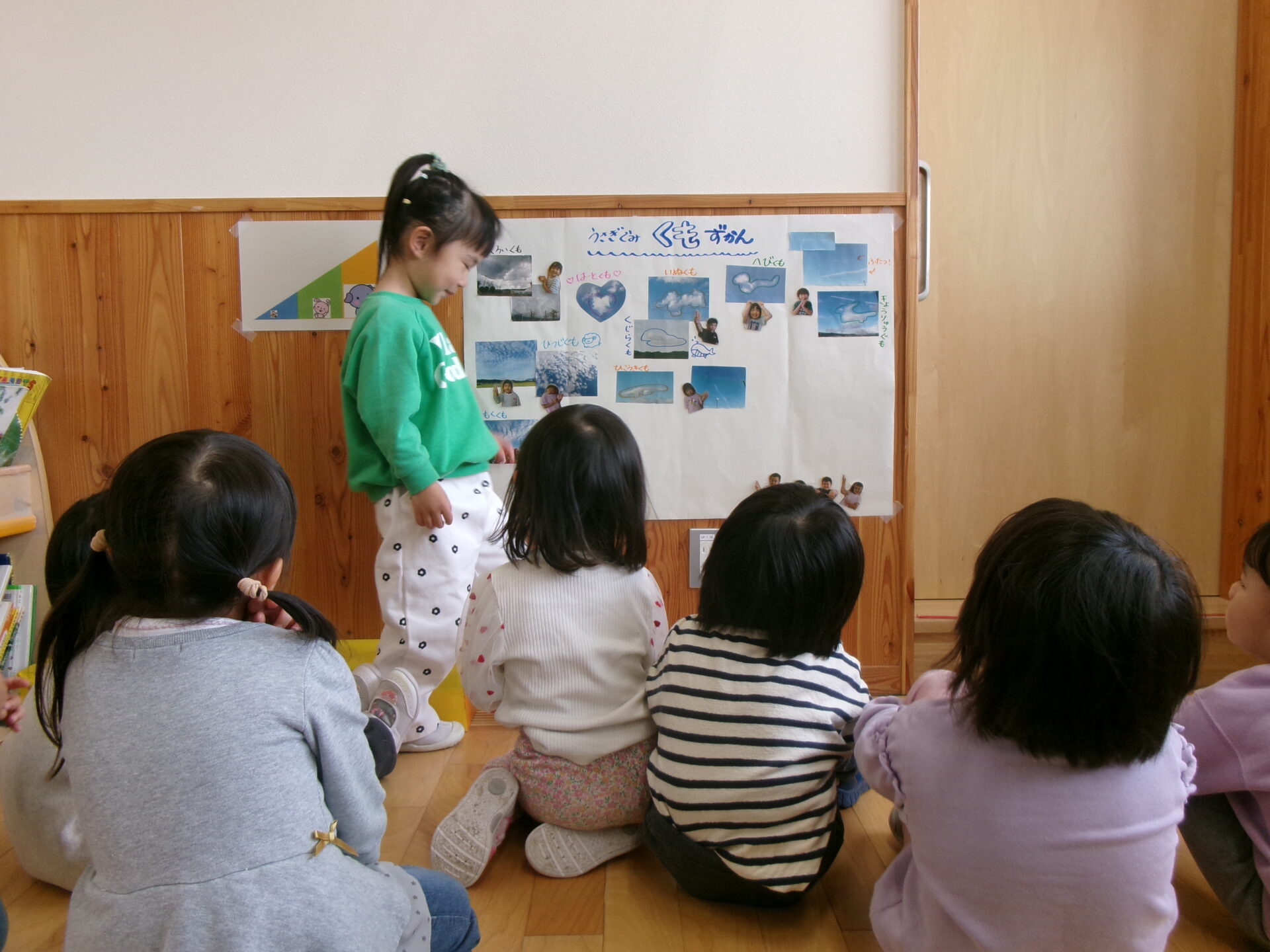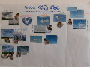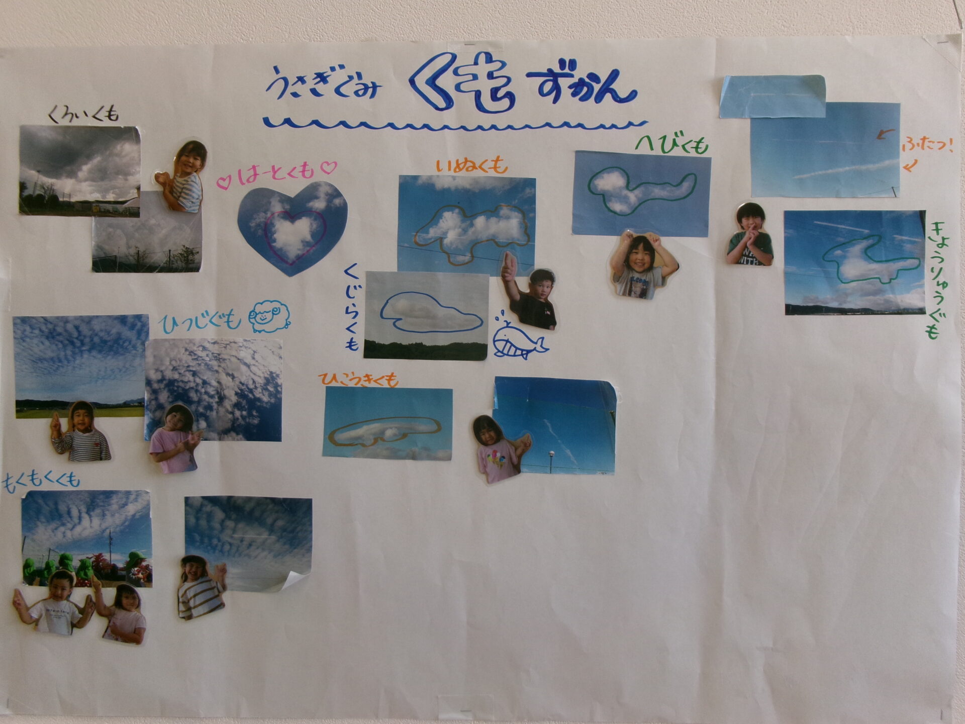 現在も、空を観察する姿があったり、お天気のお当番も続いたりしています。また、その中でみんなが見つけた面白い雲を集めた『うさぎ組くもずかん』も張り出し、発見を共有して楽しんでいます。