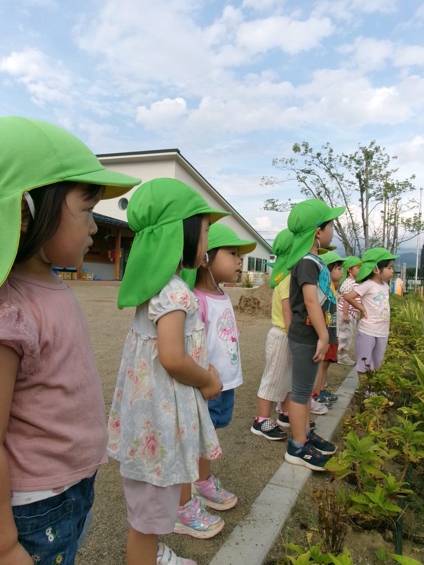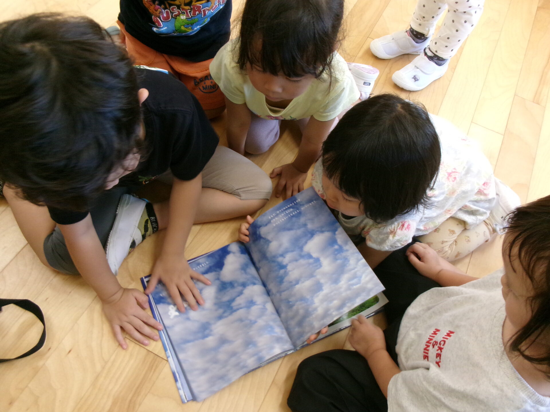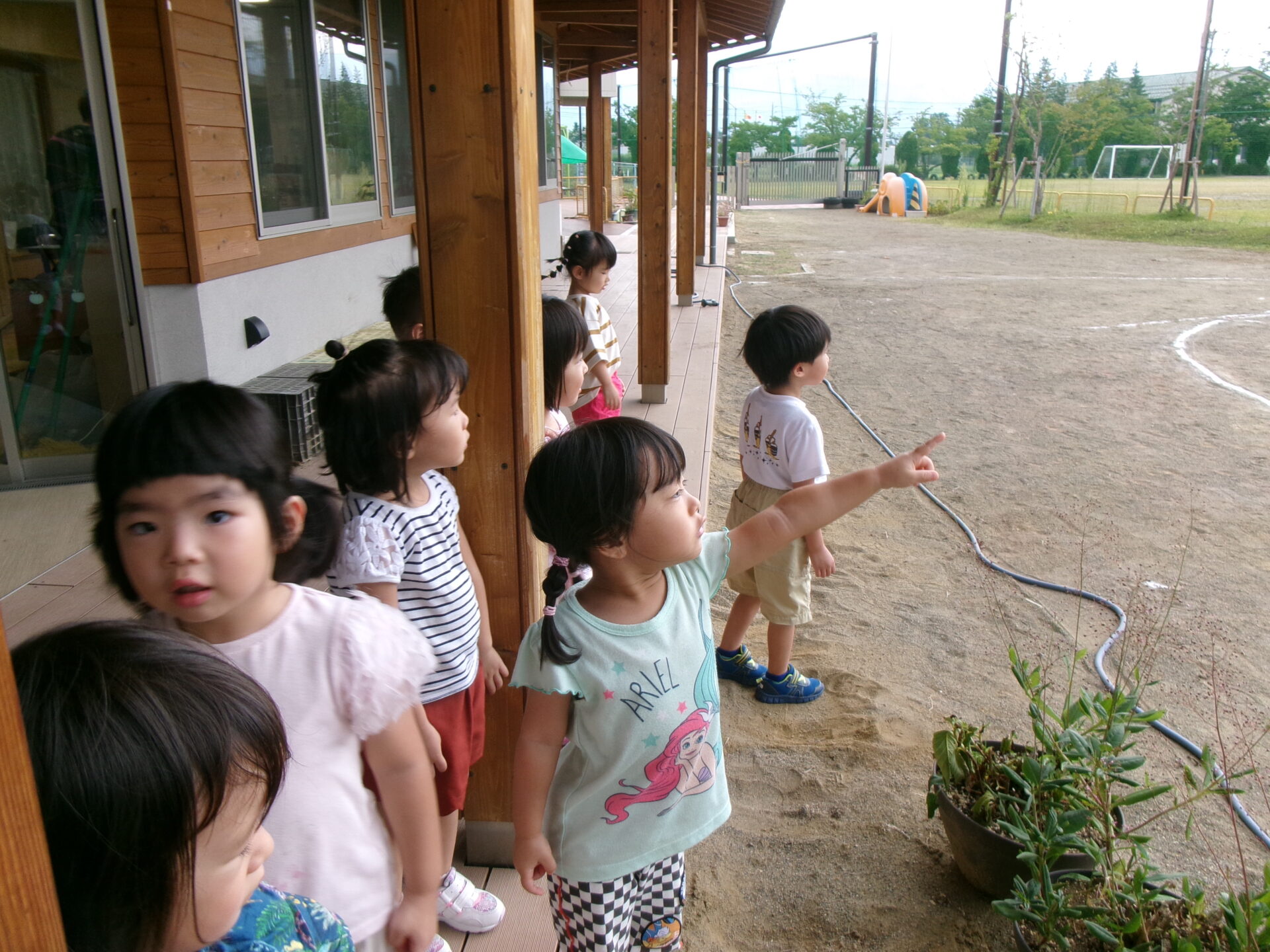 窓から見える空を見て、「せんせい、そら黒い!」と一人の子。その一言から、おやつ後には外に出て、空を観察してみることにしました。
