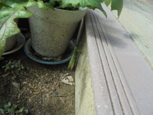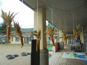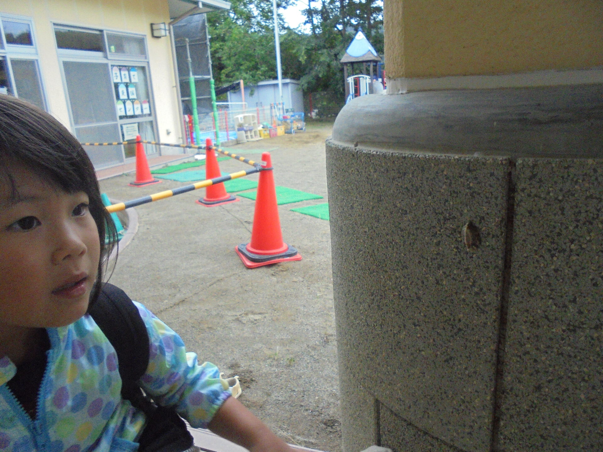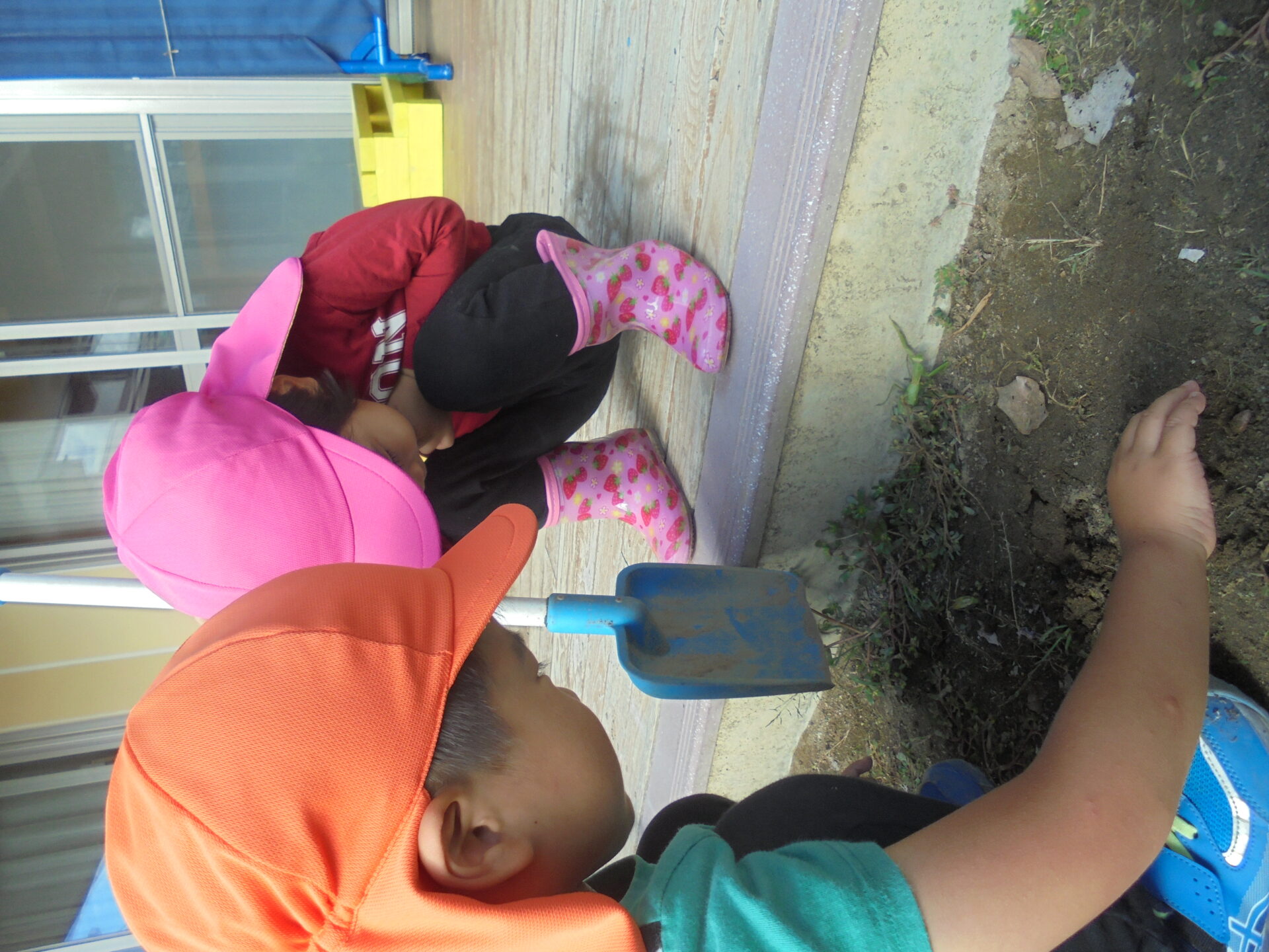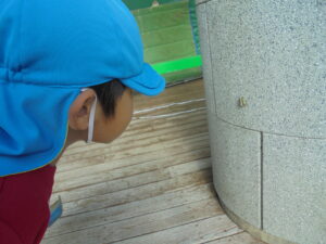 発見したのが夕方だったので、次の日はどうなっているかな?と楽しみにも繋がった翌日。子ども達はしっかり覚えていて、昨日カマキリの産卵場面を見ていない子にも教えてあげている場面がありました。園庭内ということもあり、身近な場所なので、時々観察をしながらその後の様子を追ってみていきたいなと感じました。