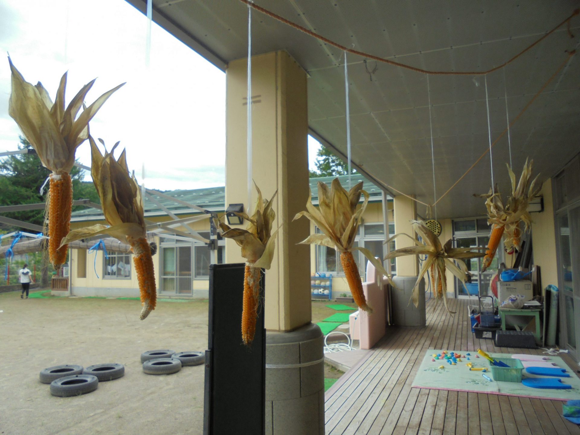 ・丸太や木の枝、ドングリ、クルミなどの自然物を拾って、制作活動などの保育に生かしている。