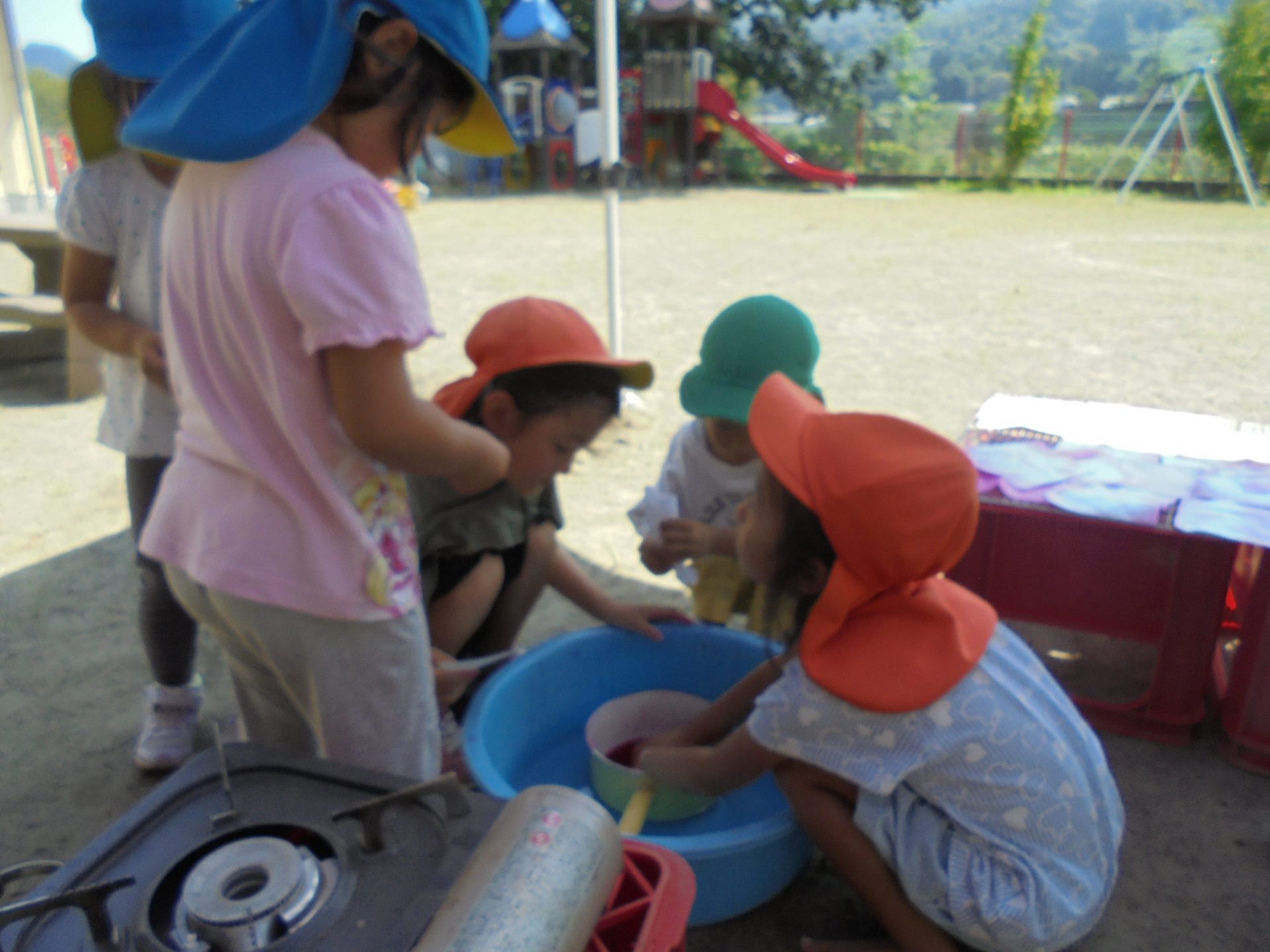 子どもが偶然、カマキリの産卵している場面を発見し、一緒に観察すると作っている最中の巣の色が自然色でないことに驚きました。普段散歩や園庭内の場面で見かけるカマキリの巣は茶色の認識があったので、子どもと一緒に驚き、新たな発見を共有でき良い学びの場面となりました。