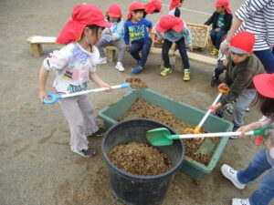 1.2歳児クラスのつくし組が、散歩で集めてきた落ち葉を園庭に広げてくれました。