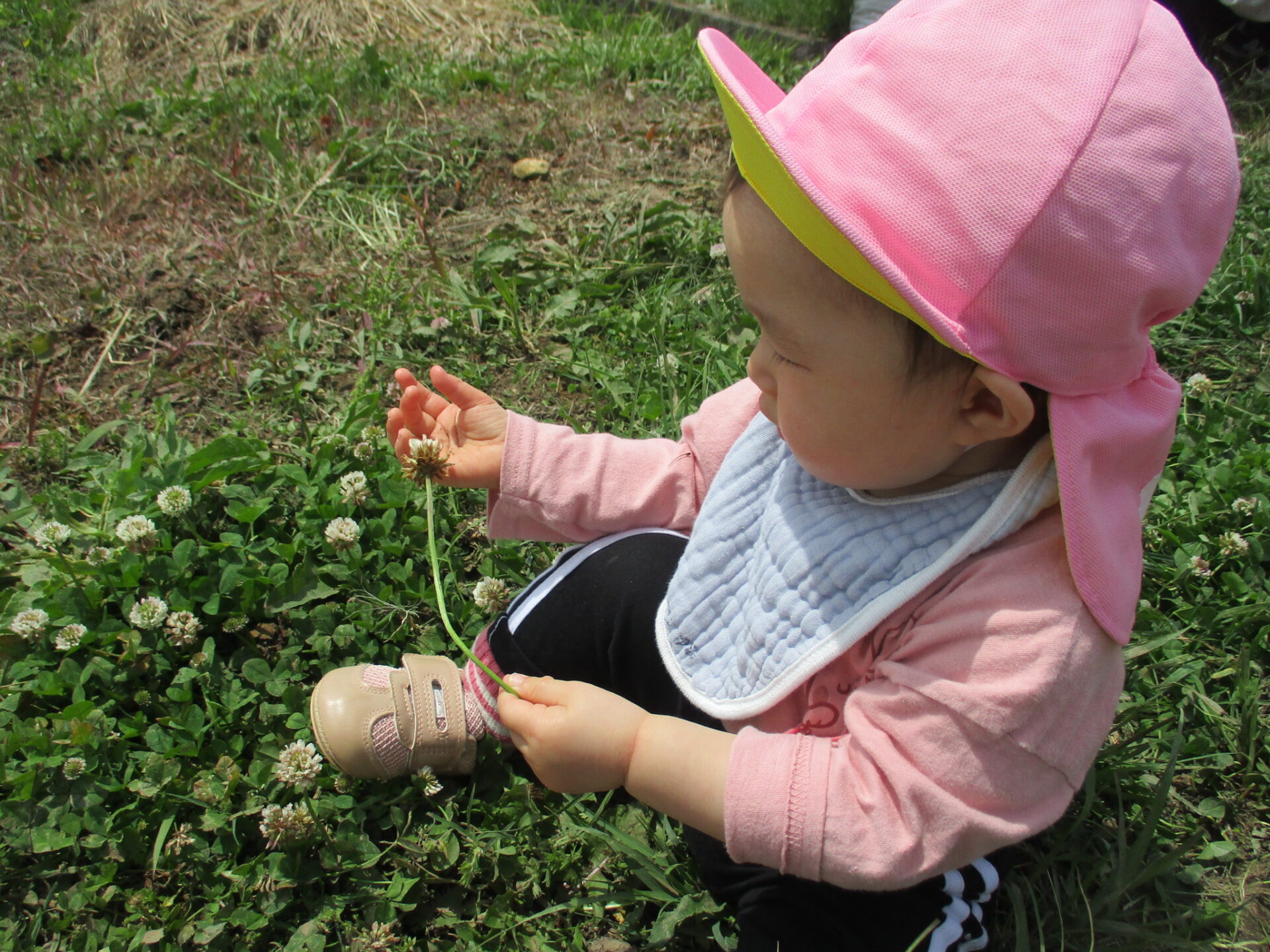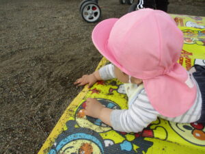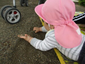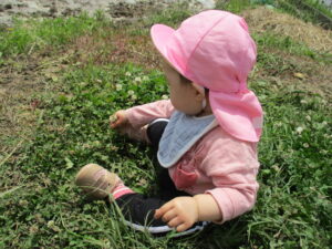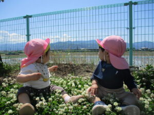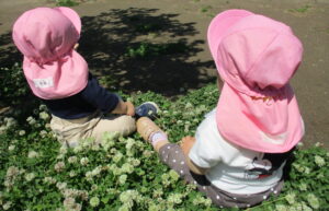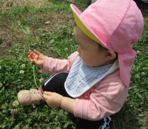 ・戸外に出かけ自分の力で歩き、自然物を見つけ触れてみようとする気持ちが育ってほしいと思いました。保育士が自然物を摘んだり綿毛を飛ばすことで、身近な植物のことを知り、興味を持って触れて、新しい気付きや発見に繋がっていくようにしたいと思います。
