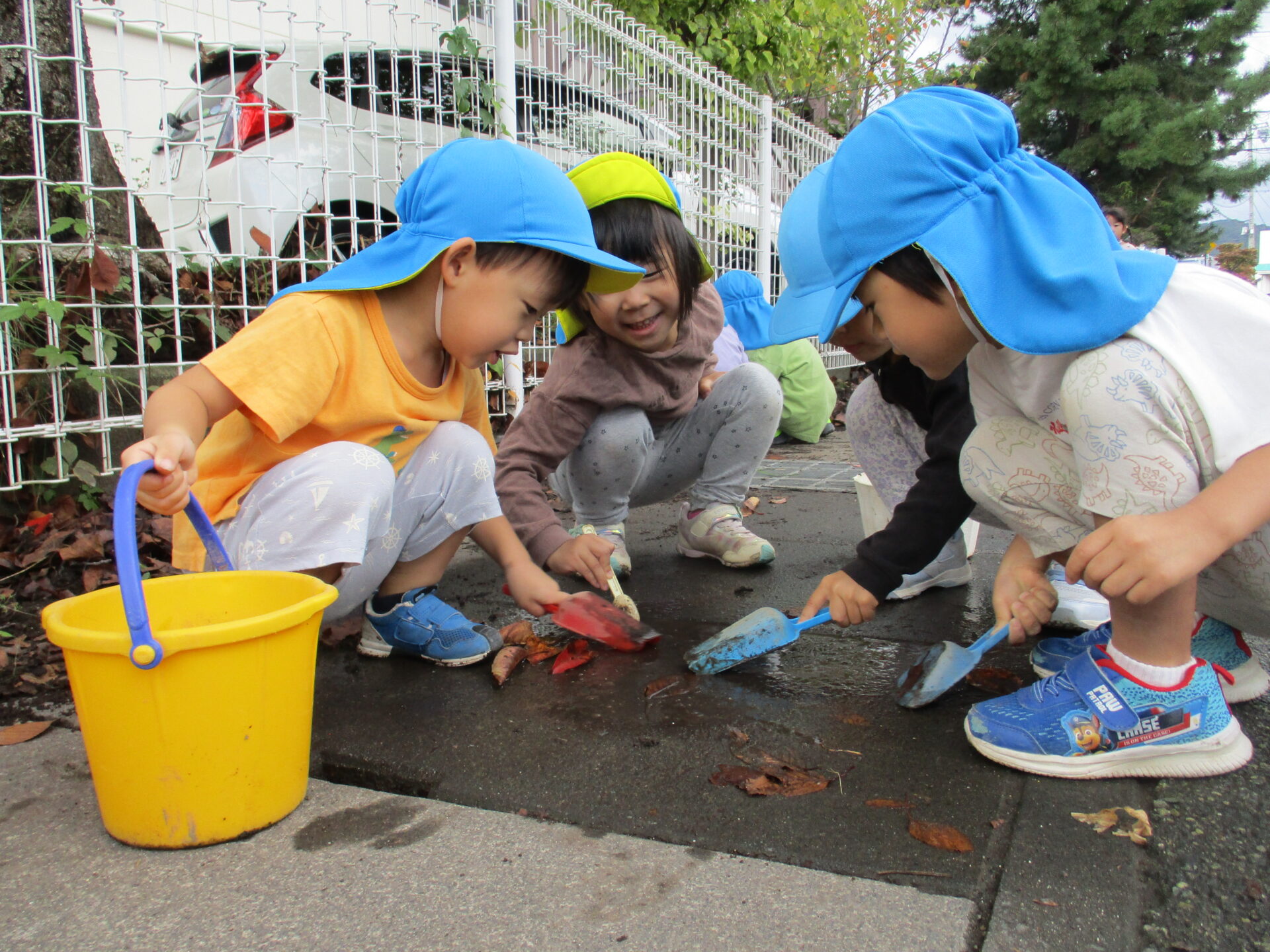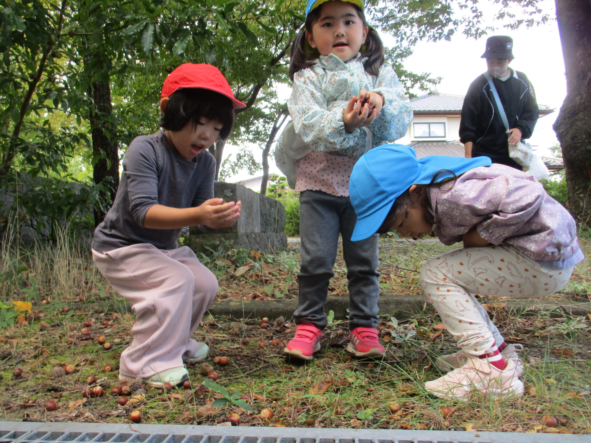 友達や保育士と「きんもくせいの匂いする!」「柿があったよ」と様々な発見をしながら楽しく歩いています。