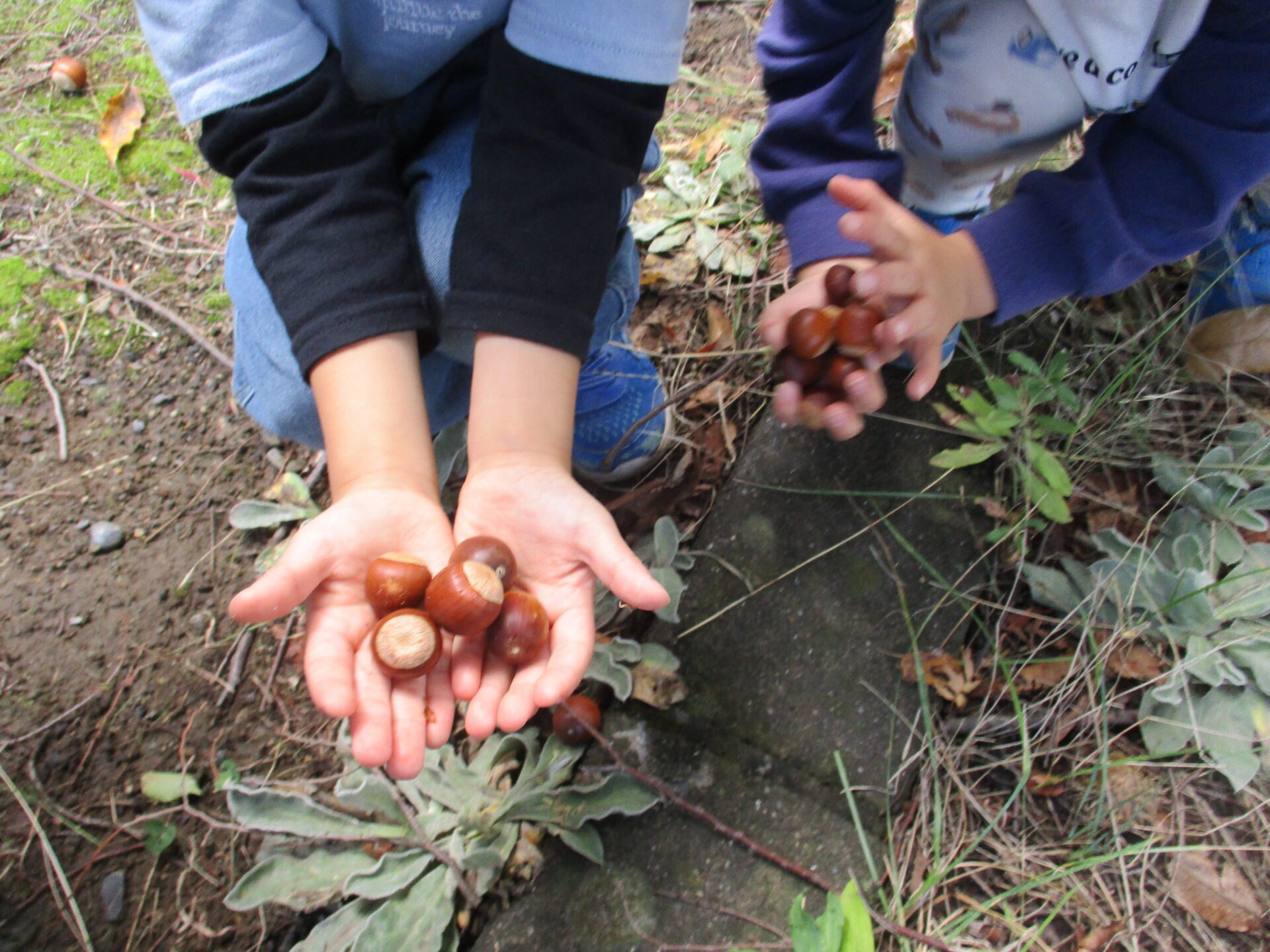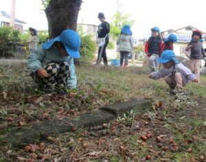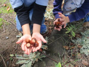 目を輝かせながら、「どんぐり見付けた!」「枝はこれがいいかな」とそれぞれ自分の発見を教えてくれる子ども達。