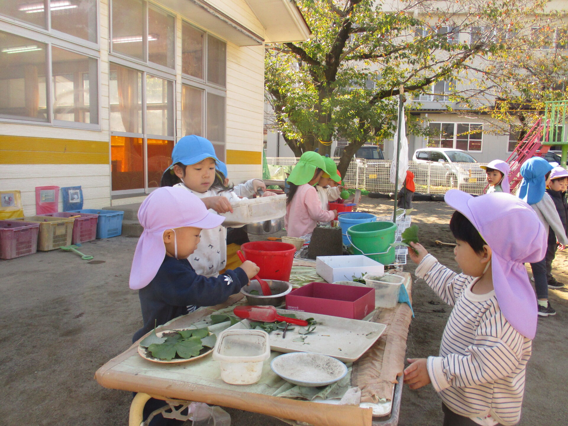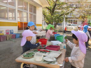 園に持ち帰り、自然物遊びをしました。木の実や葉っぱ、小枝を用いてお料理していました。