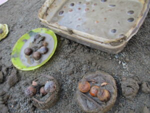 どろんこ遊びの経験から、土をチョコレートのようにトロトロにしてどんぐりを入れコーテイング。「チョコレートクッキーだよ」「みんなでハロウィンパーティーしよう」と対話しながら自然物遊びを楽しみました。
