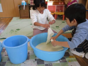 お湯で溶かした焼きミョウバンに生地を入れ、バケツの中で、もみもみ…。