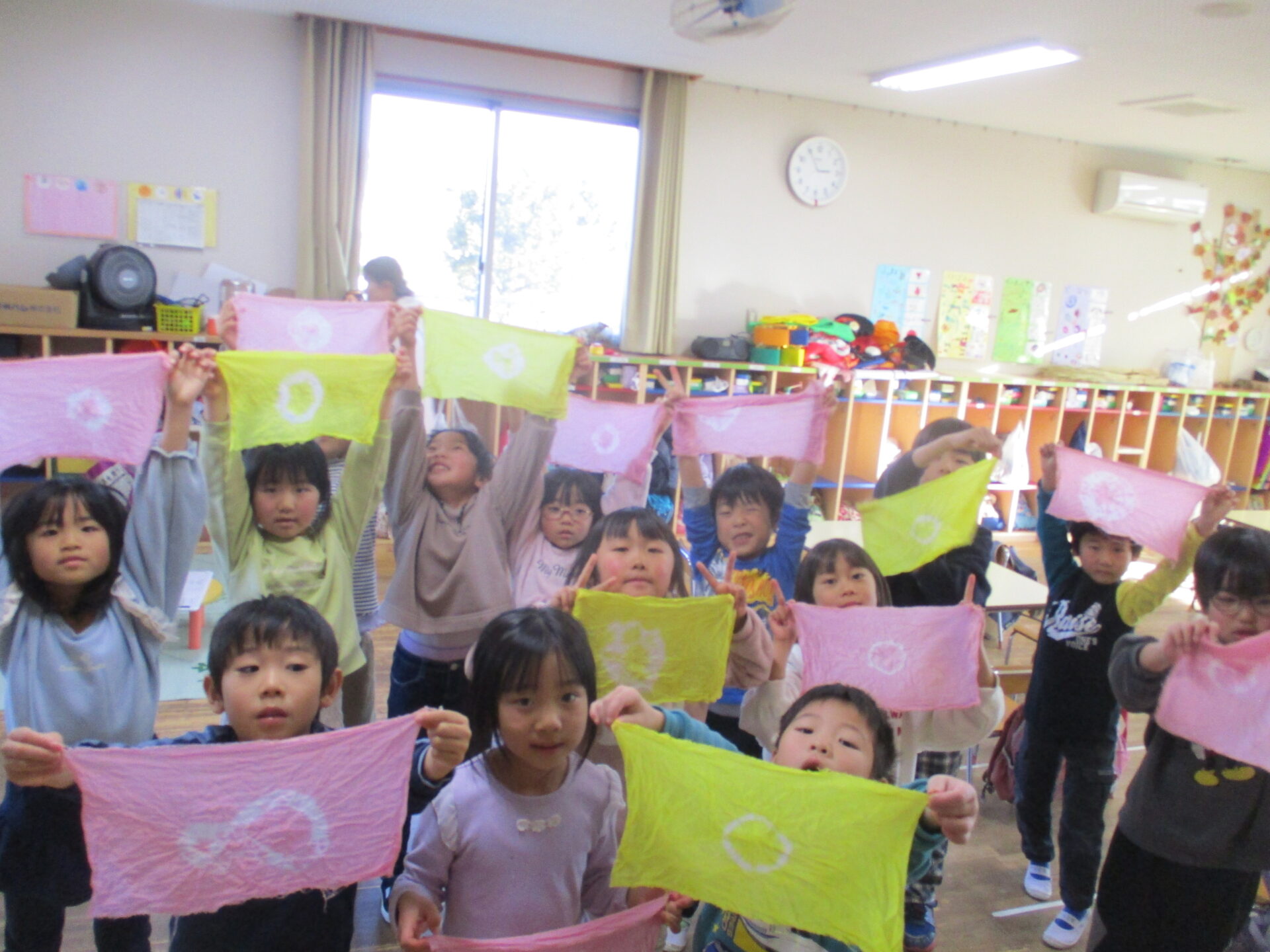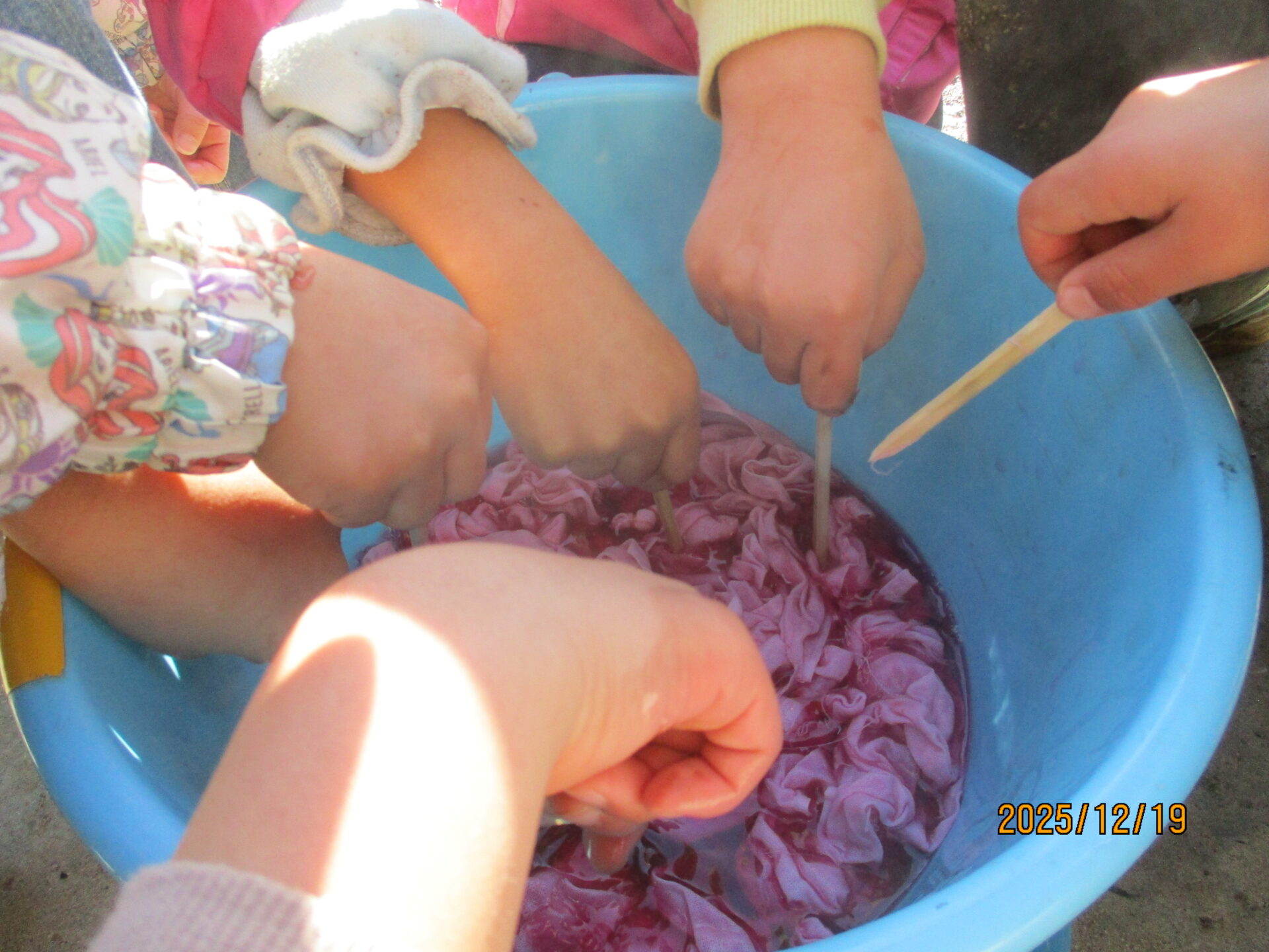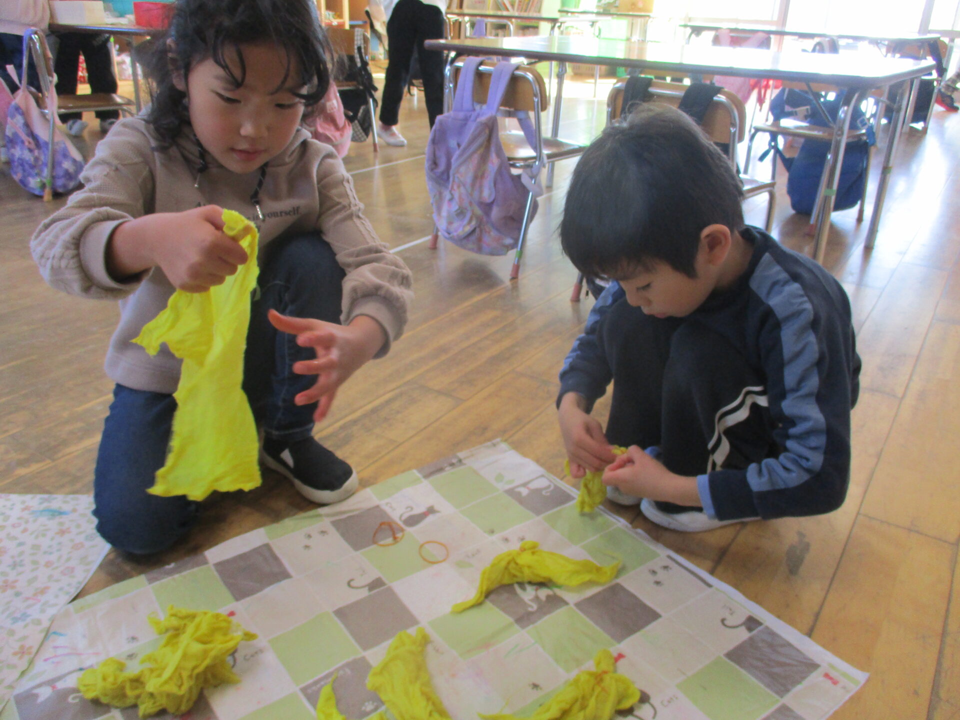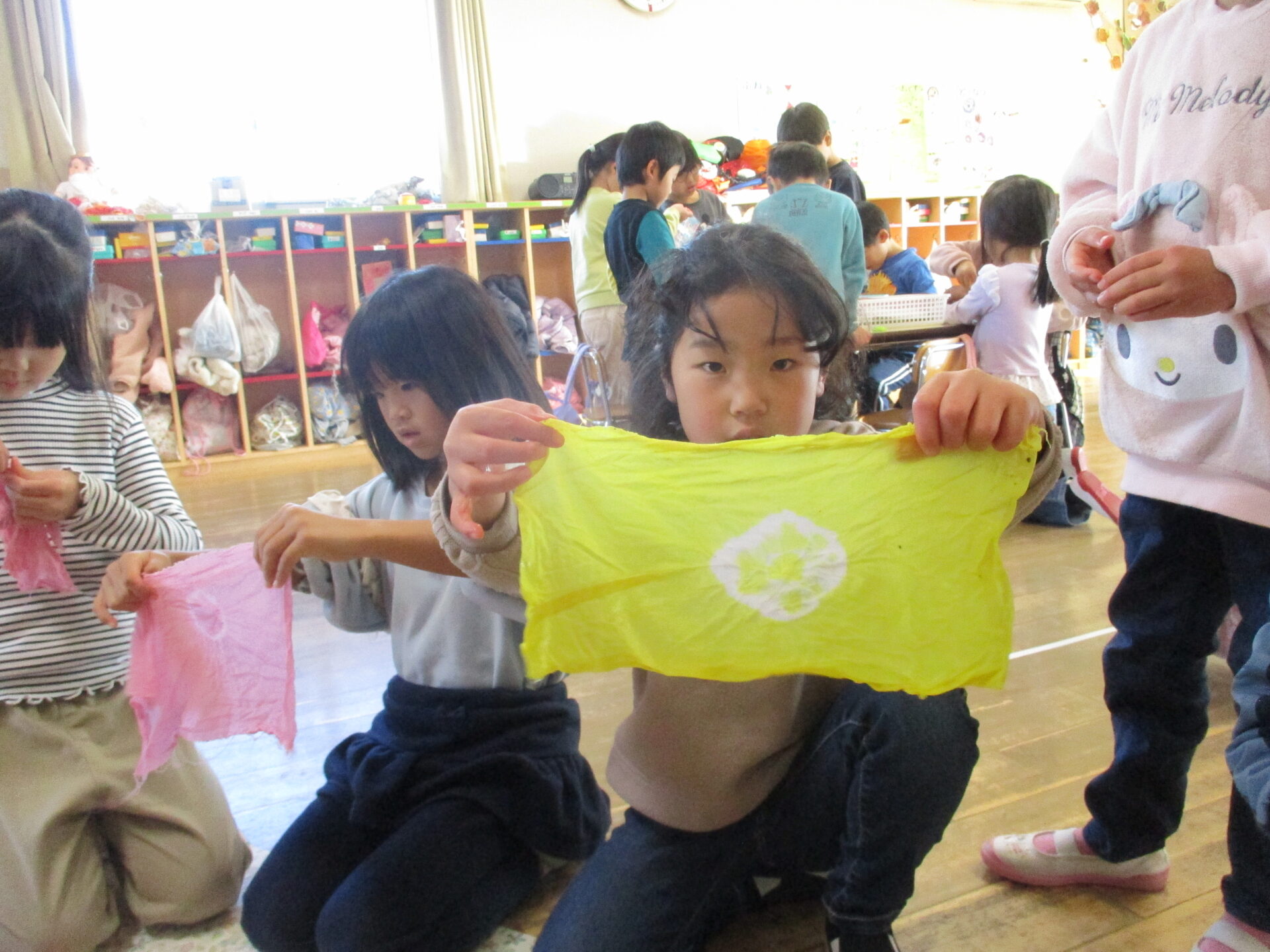 色水遊びが大好きな子ども達だったので、綺麗な色を残しておきたいと思い、染め布遊びをしました。実際に咲いていた時の匂いや色、感触を鮮明に覚えていて、それらとの違いも楽しんでいました。また、豆乳下地や焼きミョウバン等の下準備、輪ゴムで模様をつけたり、布を揉んだりなど染色の方法を知ることも出来ました。、自分達で大切に育てた花を使って染め布が出来たことが、子ども達にとって思い入れのある物になったと共に、染色の過程で匂いや色が変化することや、花の色が布に染まることの不思議さ、面白さも体験出来ました。これからも遊びを通して自然への興味関心を深めて、好きになっていって欲しいと思います。染めた物はタペストリーにして卒園製作にする予定です。
