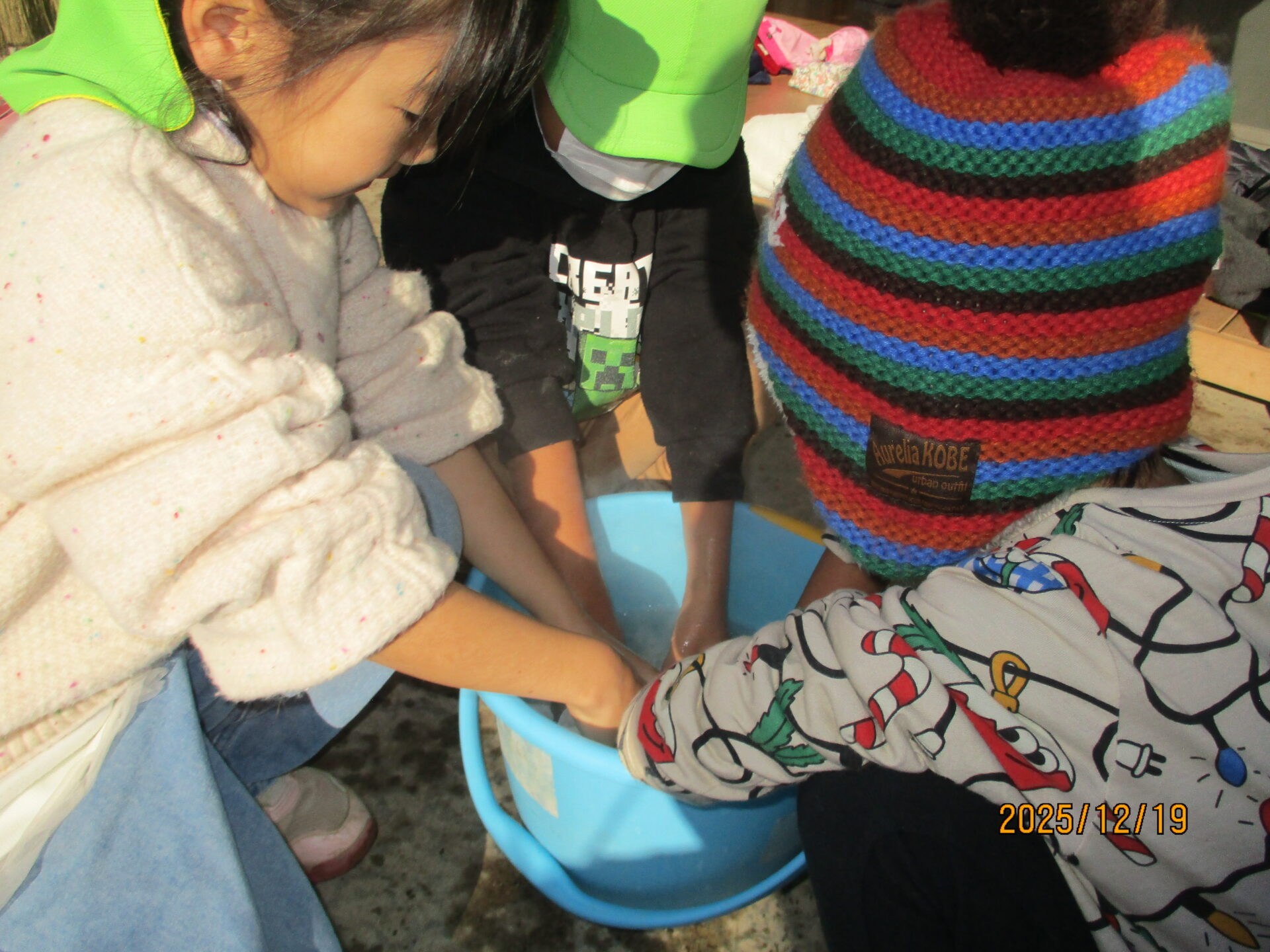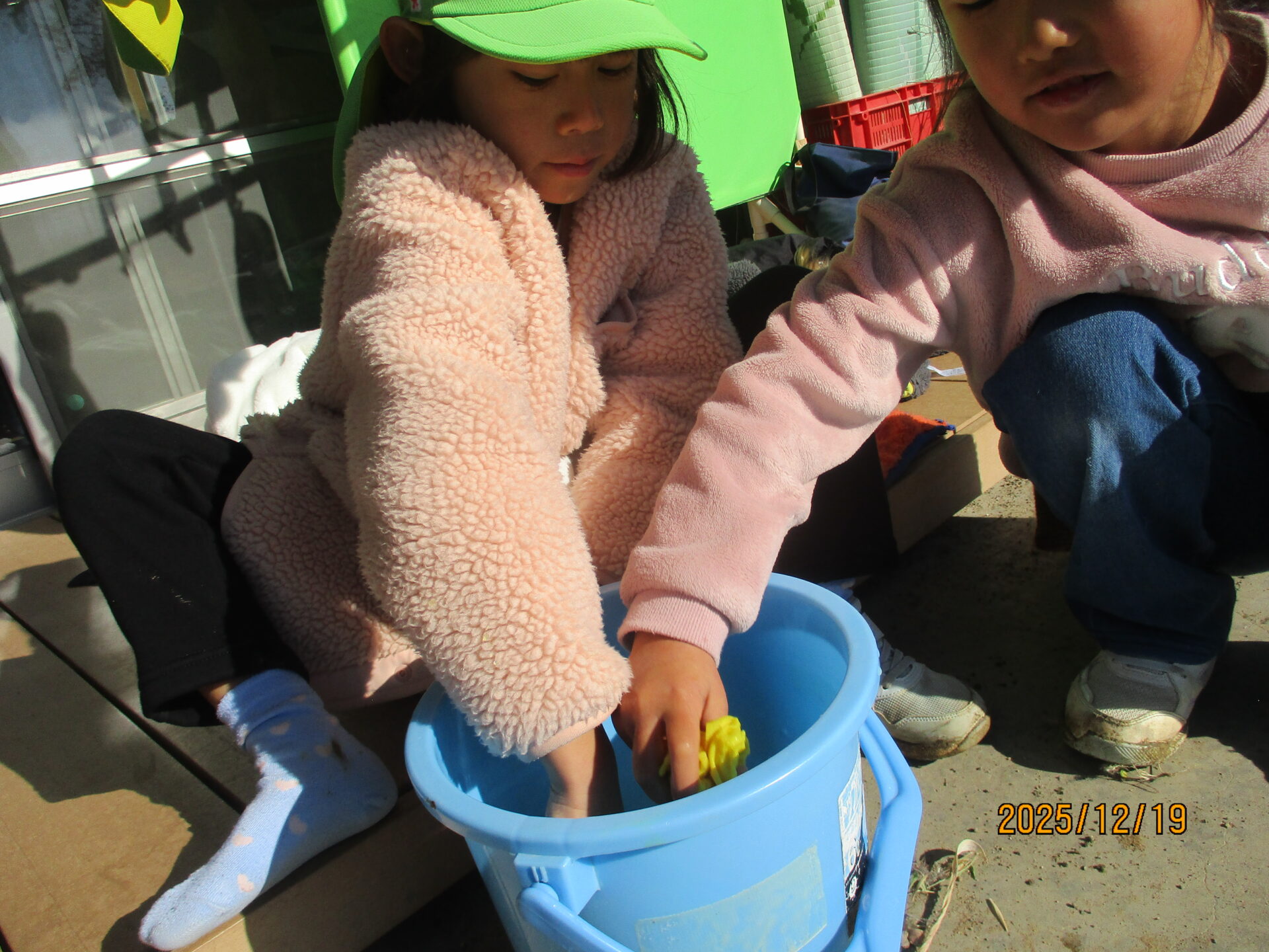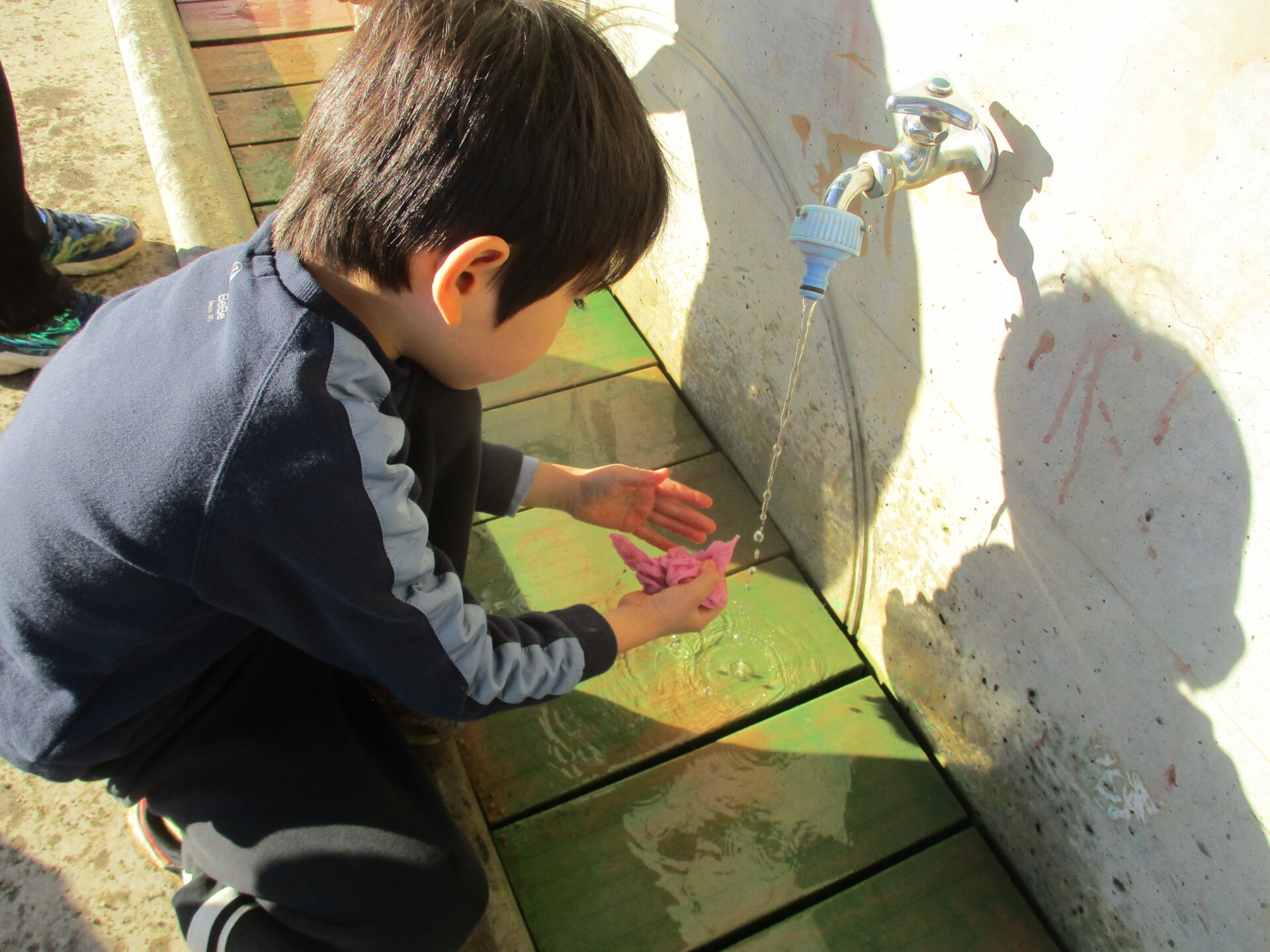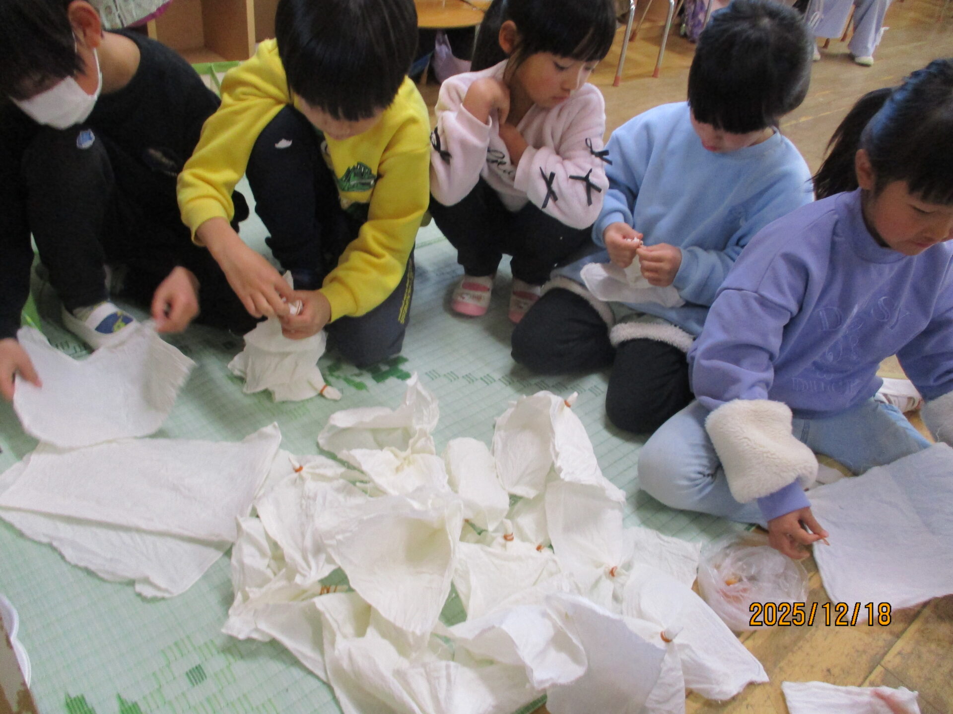 色水遊びが大好きな子ども達だったので、綺麗な色を残しておきたいと思い、染め布遊びをしました。実際に咲いていた時の匂いや色、感触を鮮明に覚えていて、それらとの違いも楽しんでいました。また、豆乳下地や焼きミョウバン等の下準備、輪ゴムで模様をつけたり、布を揉んだりなど染色の方法を知ることも出来ました。、自分達で大切に育てた花を使って染め布が出来たことが、子ども達にとって思い入れのある物になったと共に、染色の過程で匂いや色が変化することや、花の色が布に染まることの不思議さ、面白さも体験出来ました。これからも遊びを通して自然への興味関心を深めて、好きになっていって欲しいと思います。染めた物はタペストリーにして卒園製作にする予定です。