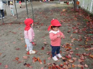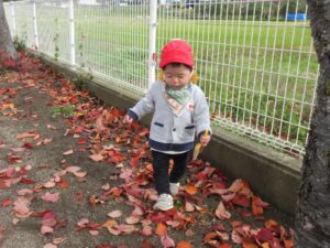 はいはいしていると手元にも足元にも葉っぱがいっぱい!カサカサ音がします。