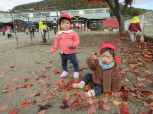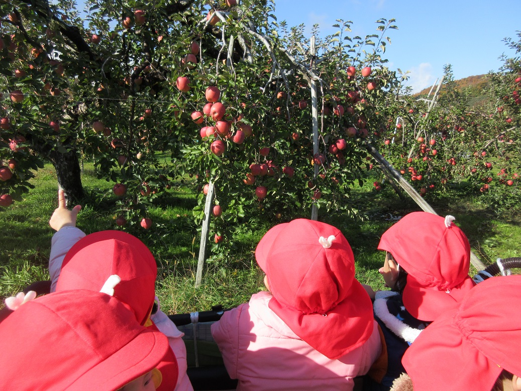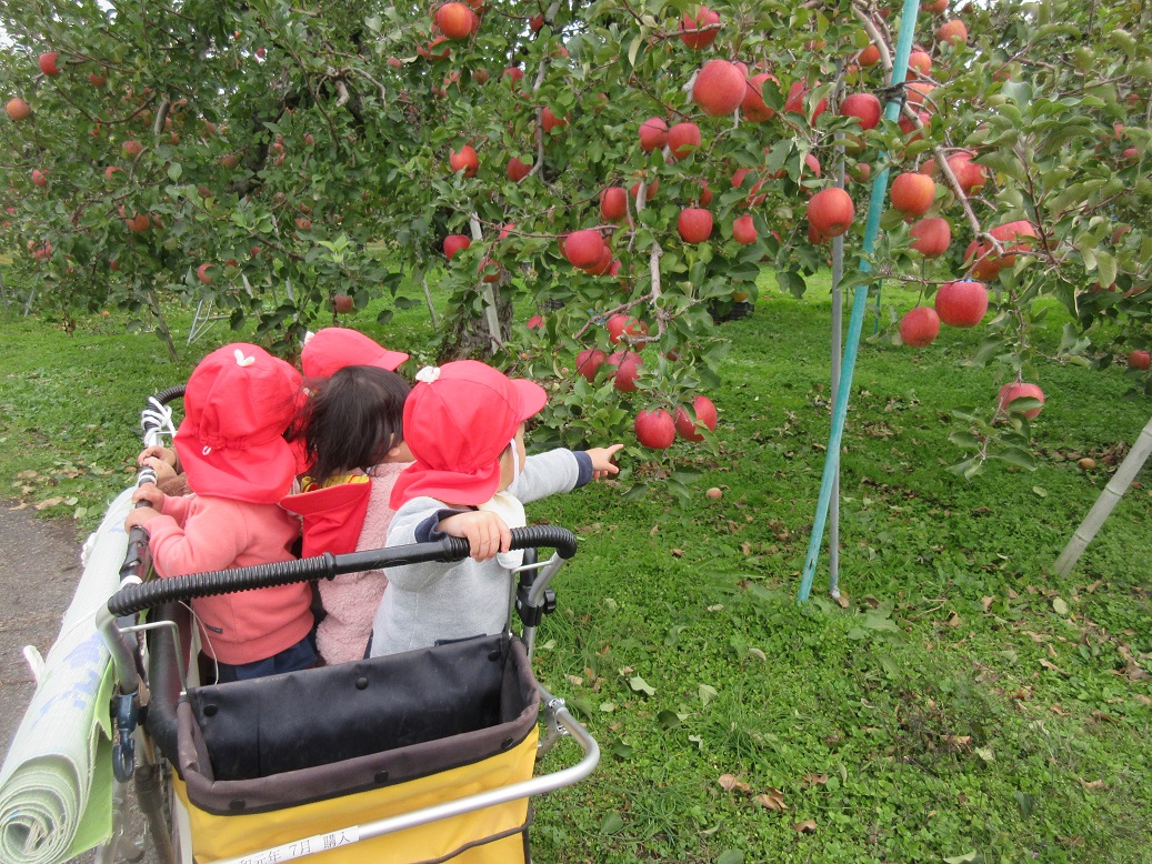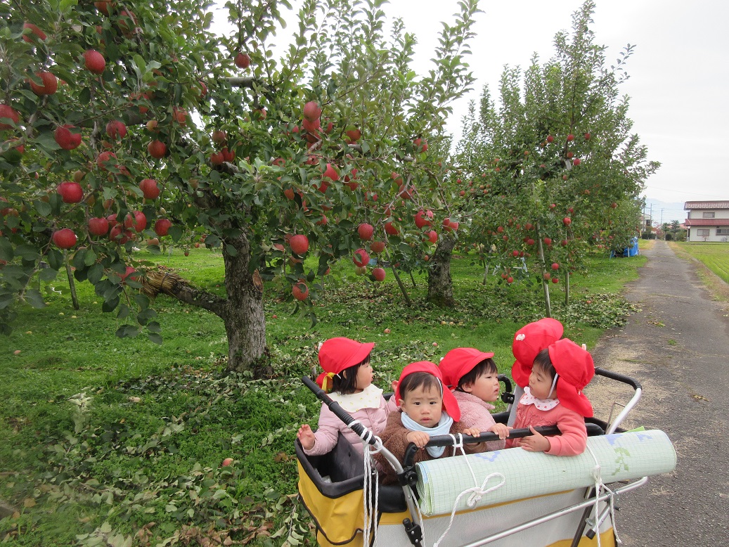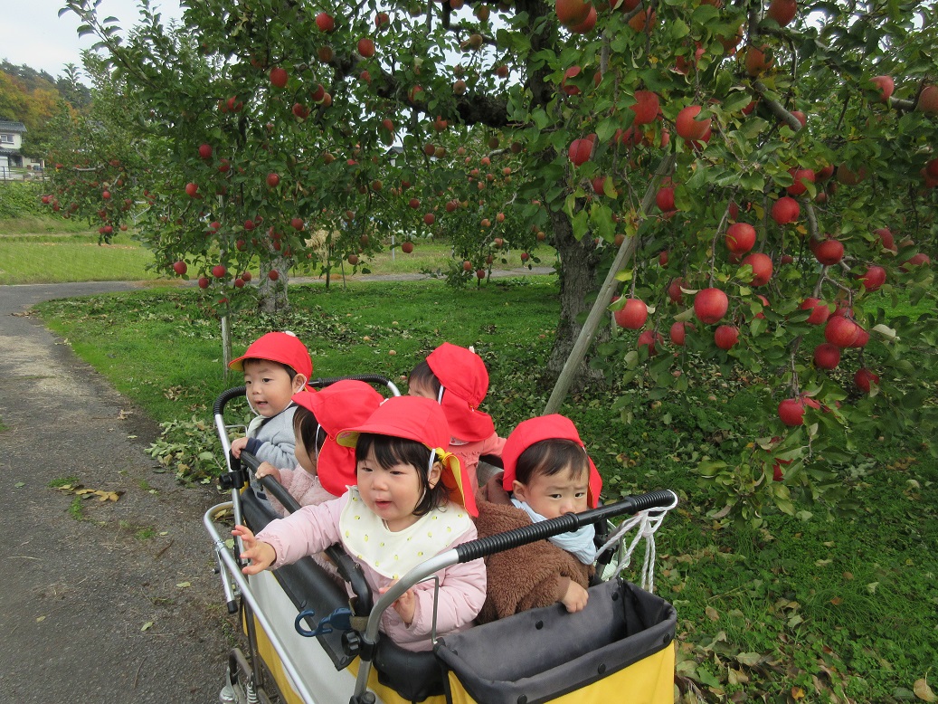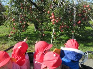 来年の秋は「いっぽっぽコース」も「りんごっこコース」も歩いて行きます。美しい秋、澄んだ空気の中を子ども達と散歩できることがとても楽しみです。また、実っているりんごと、おいしく食べているりんごが同じものだと知る体験もしていきたいです。もしかすると、0歳児でももう知っているかもしれませんけどね。