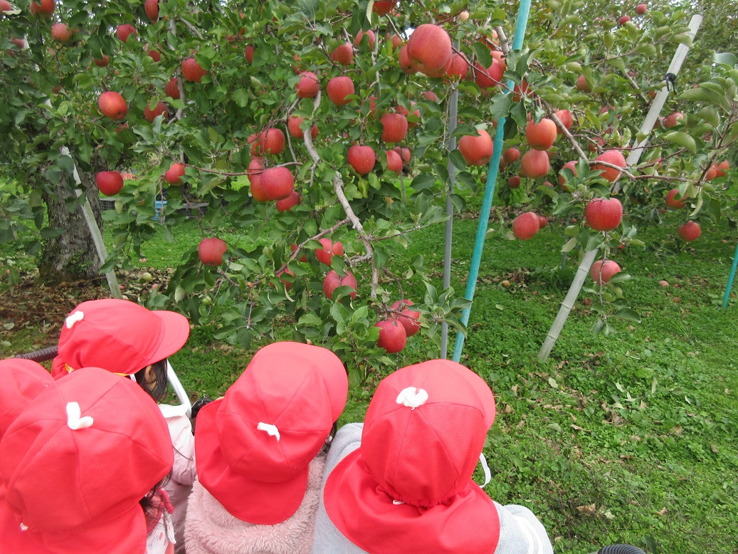 保育園から見渡せる所に実っているりんごを子ども達が気にしていたので、翌日は園外に出掛けてみました。