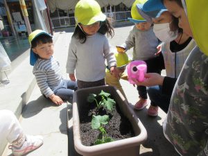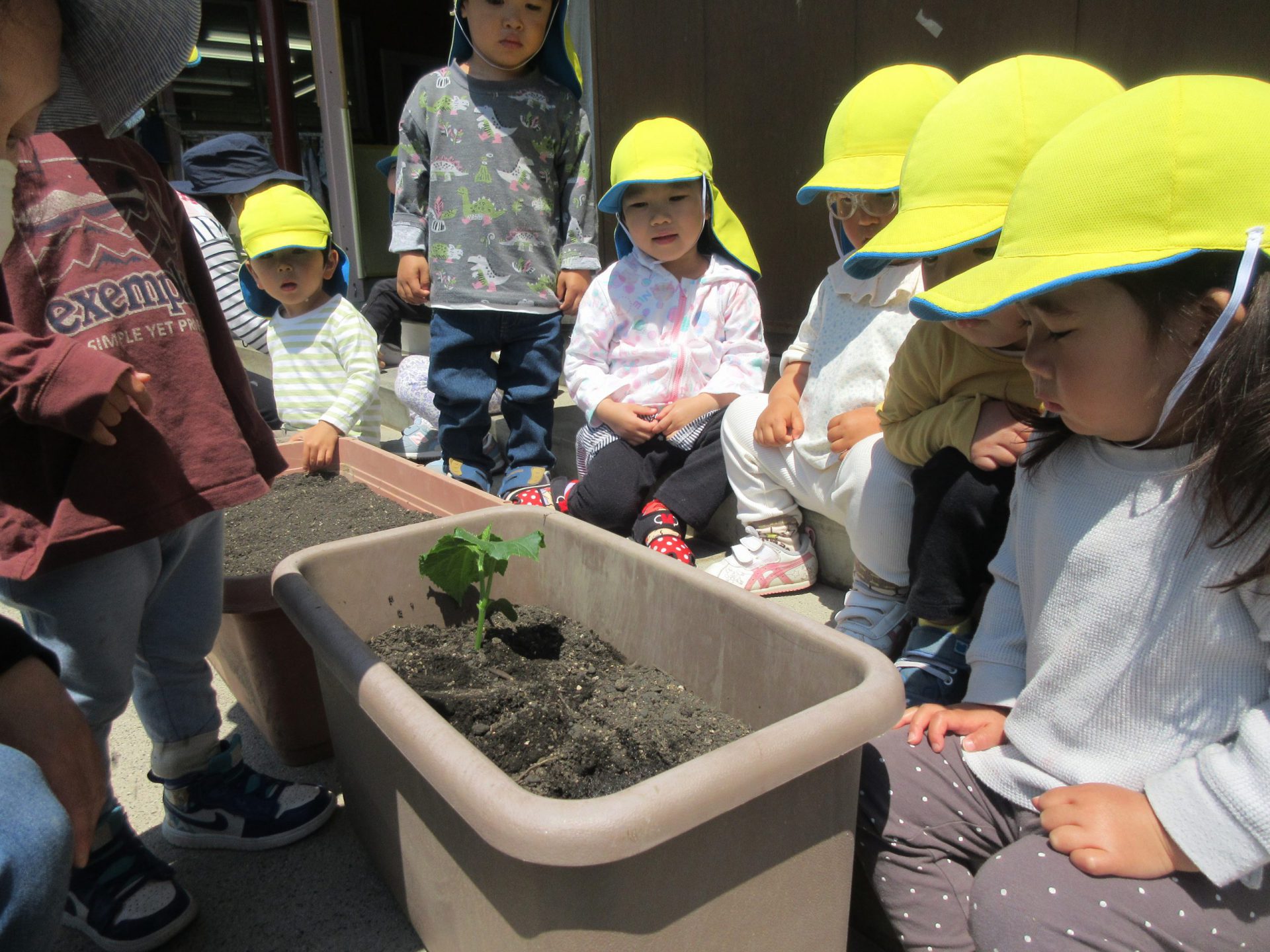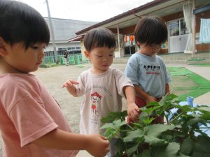 ・園庭北側にある畑で野菜作りをしています。そこに虫たちが集まってきて、子ども達の人気の場所になっています。