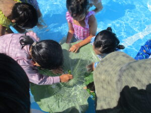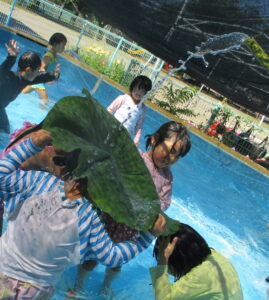 水の中を手探りでレンコンを探していると子どもたちが「どこにあるの?」地域の方「なかなかわからないんだよ~」と手探りで泥水の中を探し掘ってくれました。