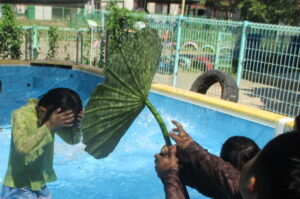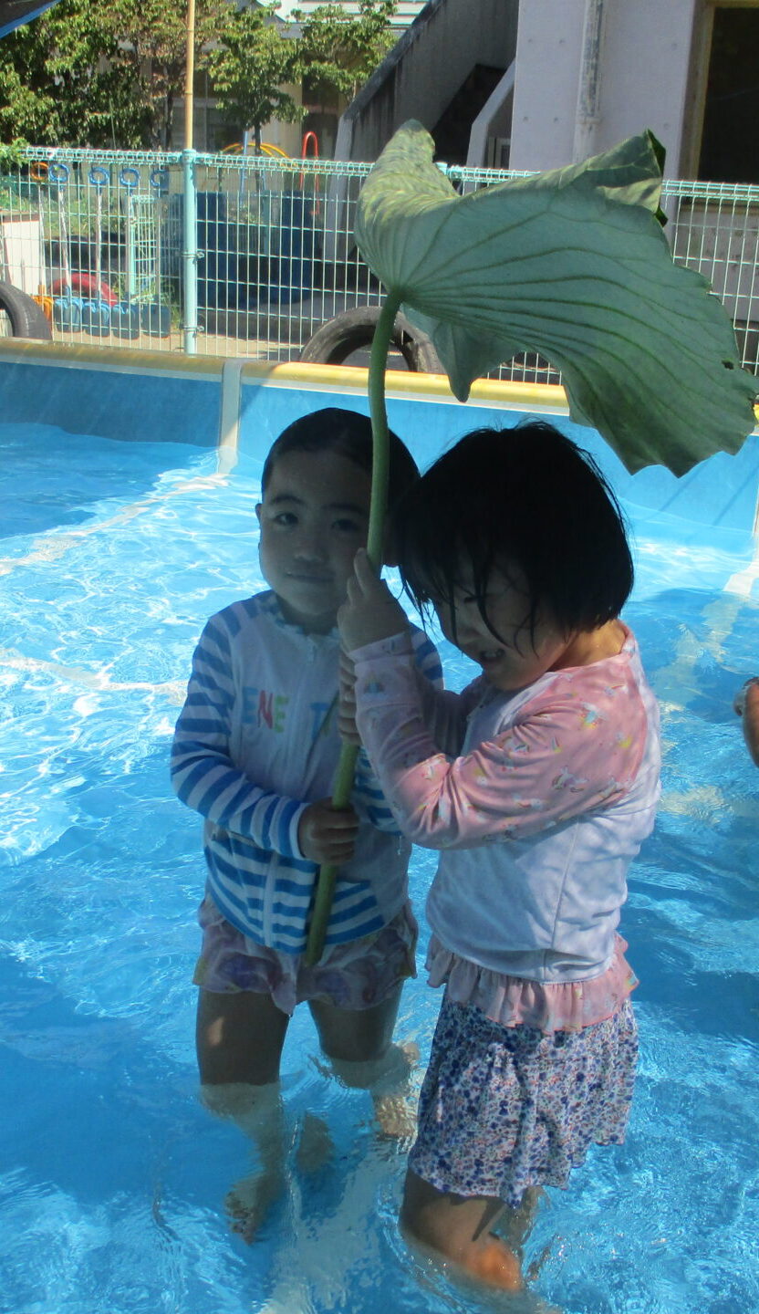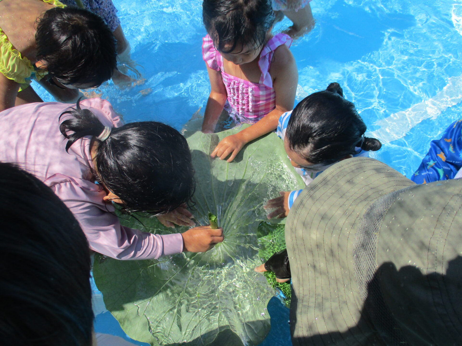 ・「子どもは地域の宝」として地域全体で子どもたちを大事に見守っている土地柄です。地域の名産である綿内れんこんを10年ほど前から地域の方に協力してもらい、園庭で育てています。