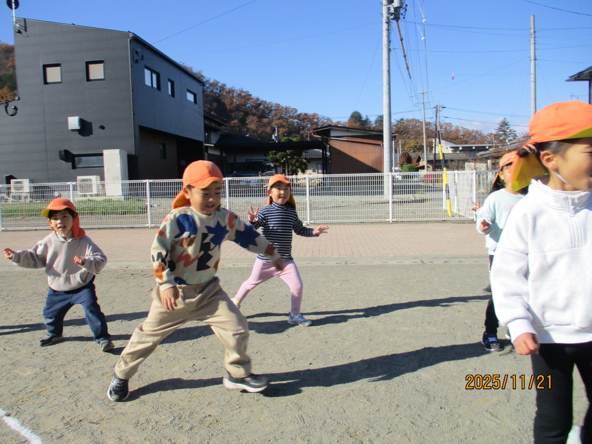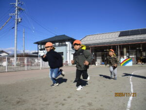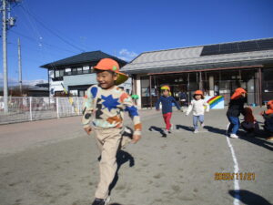広い園庭では体を温めようと運動遊びをする元気な姿が見られます。