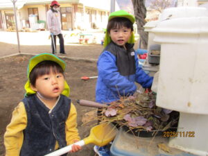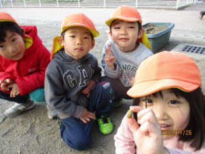 ・スパゲッティに見立てて遊ぶ姿や、「タケノコこびと」と大発見した子ども達に共感していきながら、より遊びが深まり自然物に関心が持てるように今後も見守ってきたいと思います。