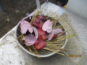 ハナミズキ、柿などの落ち葉や枝を使ってお料理作り!「スパゲッティ作ったよ」