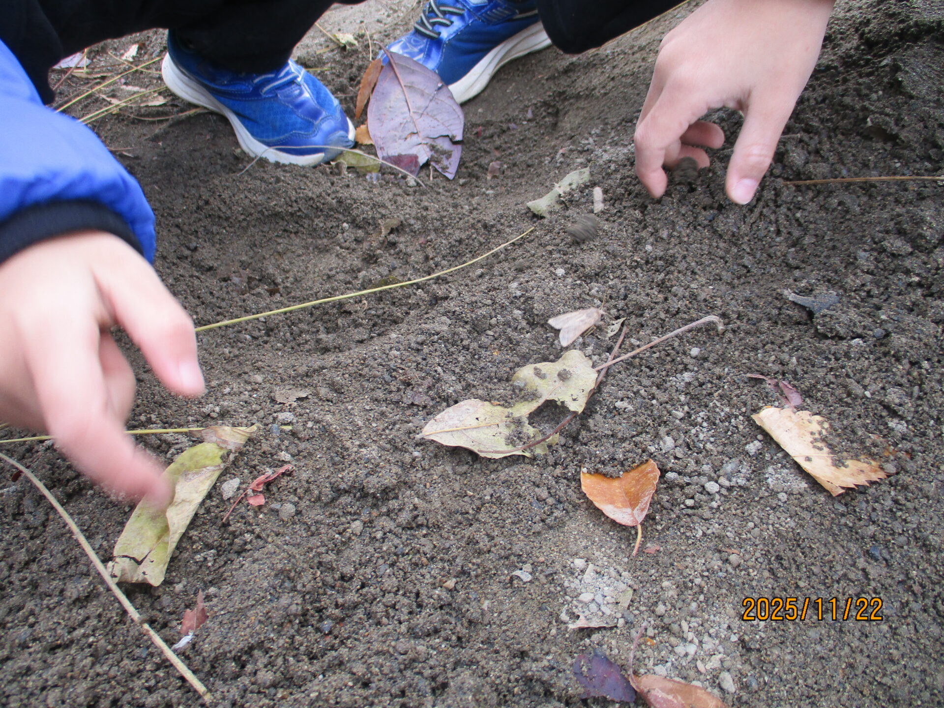 小さな蛾が落ち葉に紛れてまるでかくれんぼをしているみたいです。子ども達もそーとのぞき込んで「どこにいるの?」と興味津々!「見つけた!落ち葉にそっくりな色だね!」と言っていました。