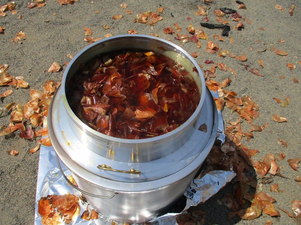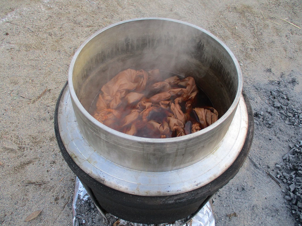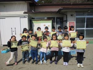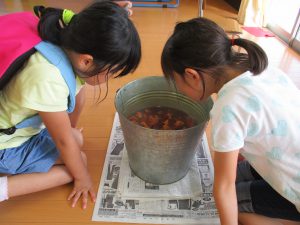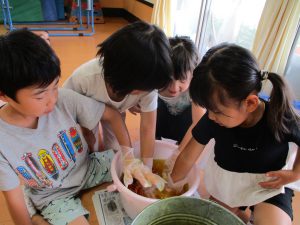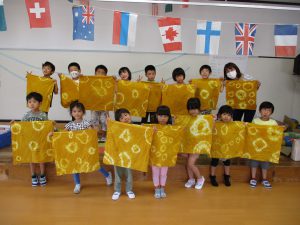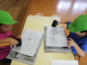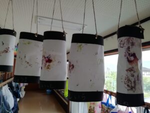 年中さんの育てた赤しそは、たたき染めにしてなつまつりのちょうちん飾り。