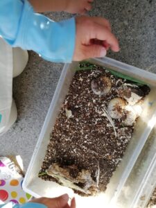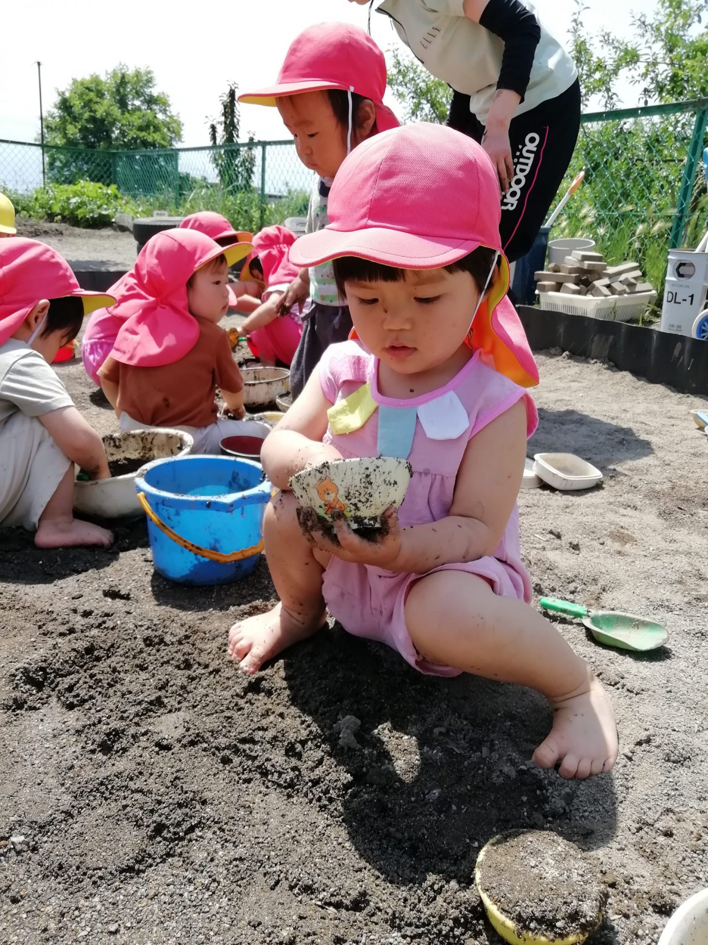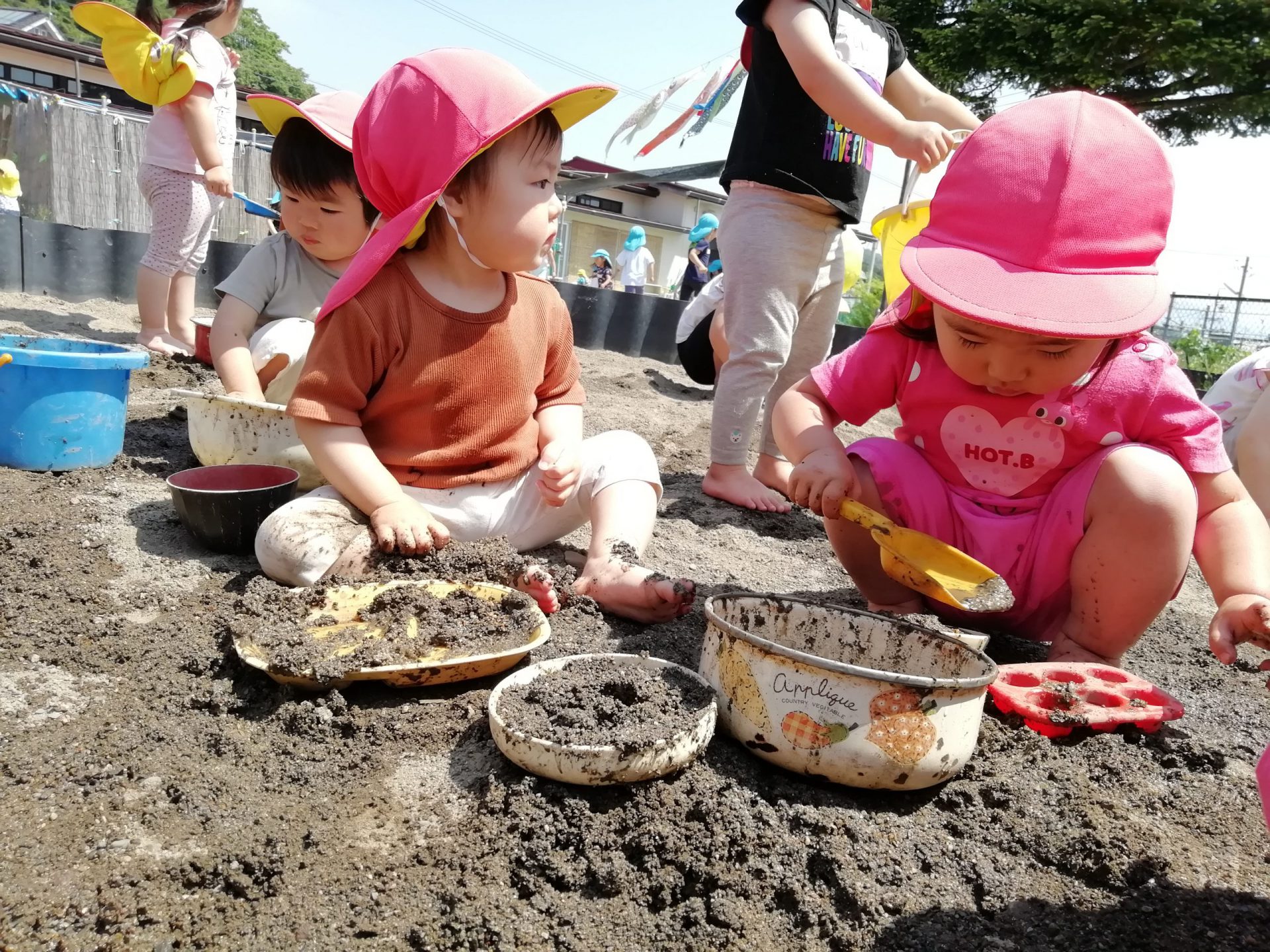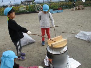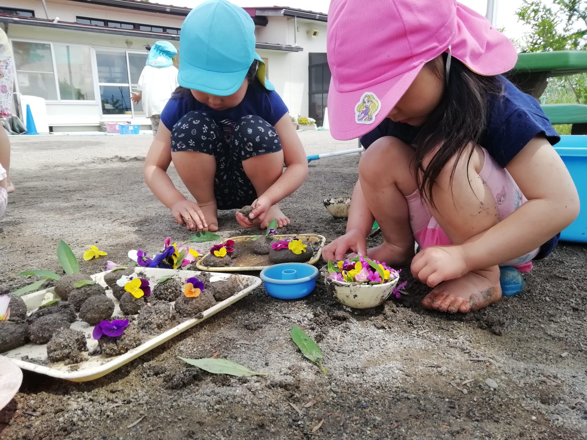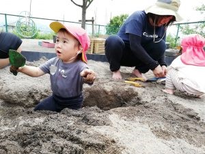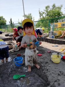 ・泥に水を少し混ぜると固い泥だんごができること、水をたくさん混ぜるとどろどろになりプリンやチョコレートのようになることに気づき、感触を楽しんでいました。