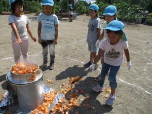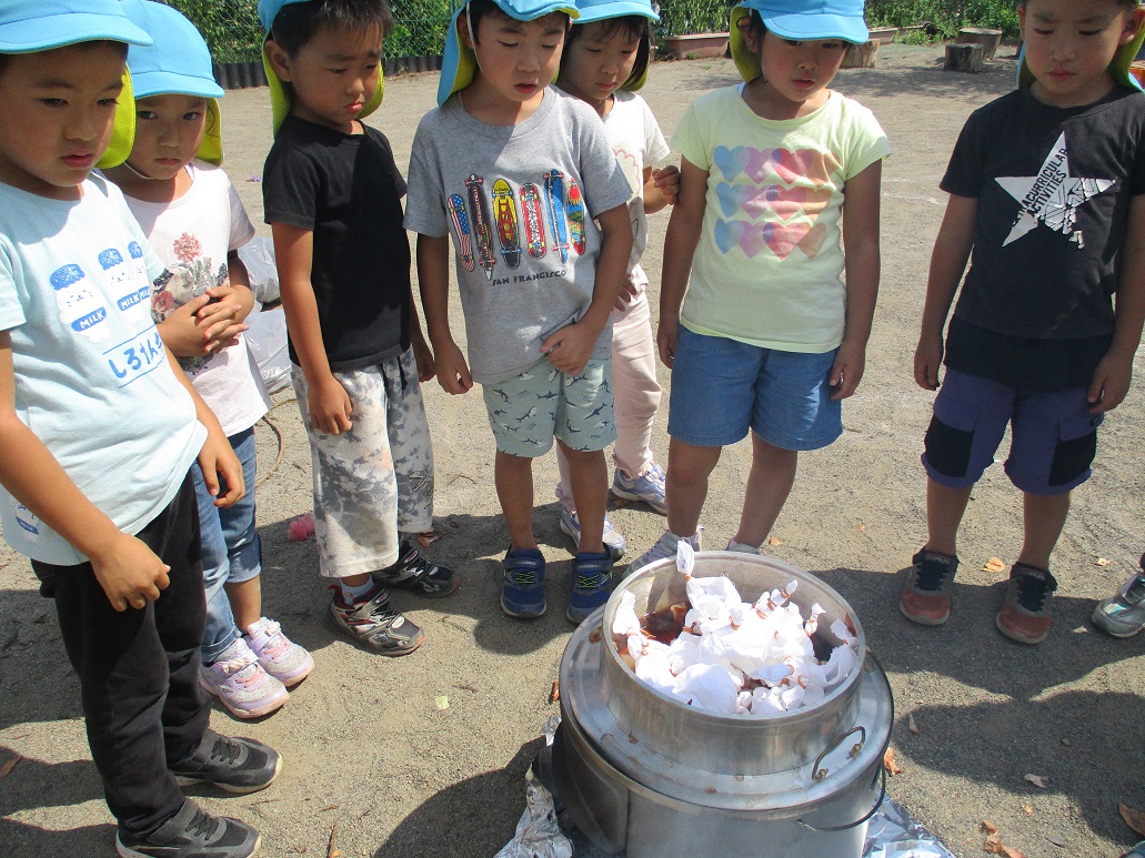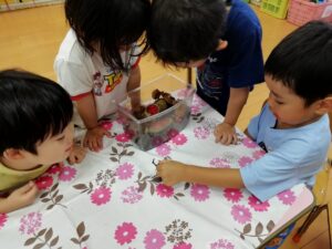 子どもたちは夏の間、触れて・感じて・味わって…と五感を使い、いろいろなことを感じとることができました。また自ら経験していくことで、発見したり、小さな変化に気づくこともできました。