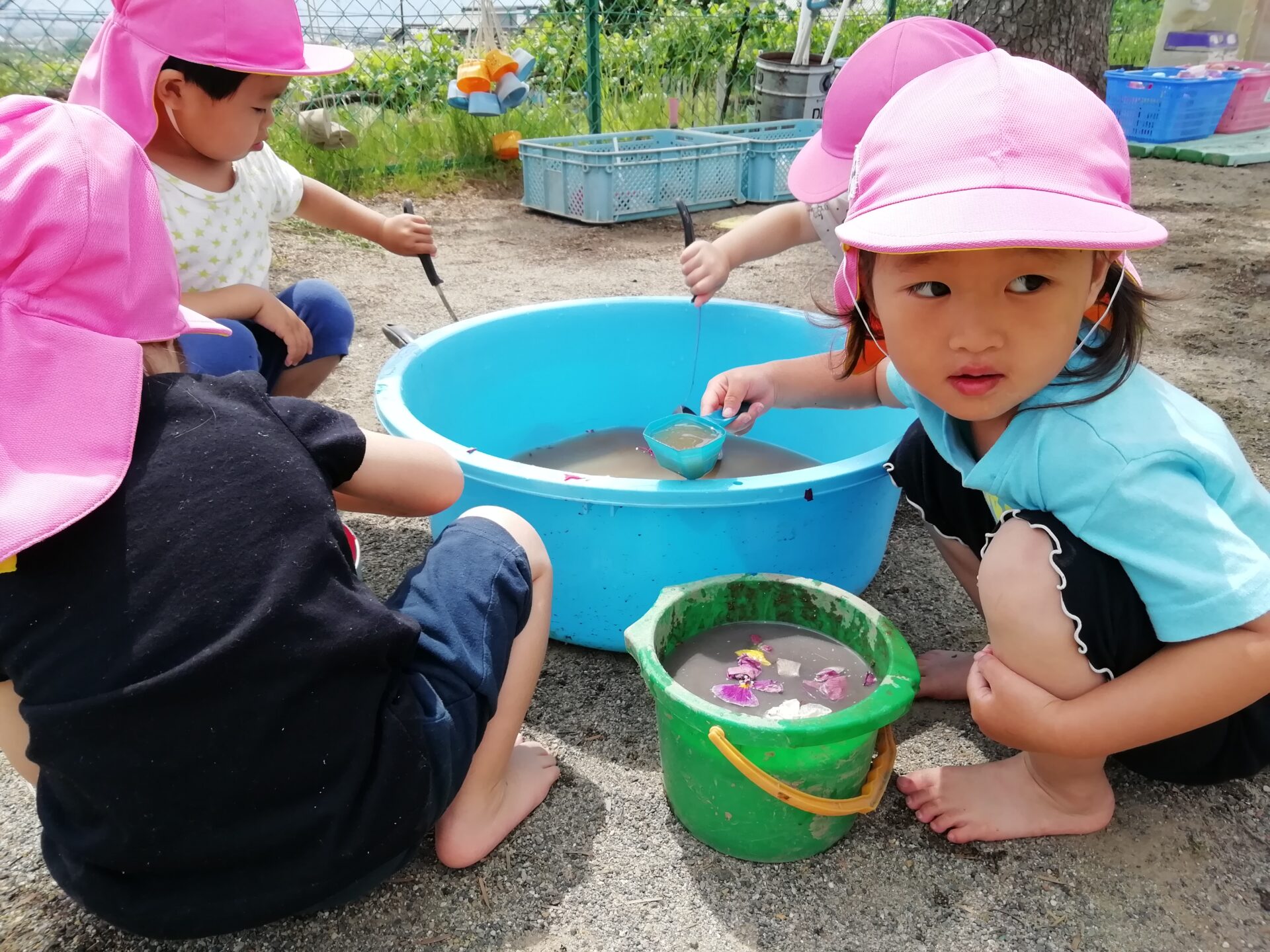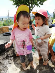 「お水、温かくてお風呂みたい。でもこっちの水はつめたいよ。」と、水の温かさのちがいを発見。