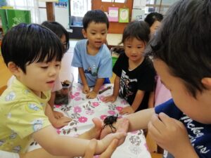 おそるおそる触ってみたり、羽を広げる様子に「わー、飛んだー。」と驚いたり・・・