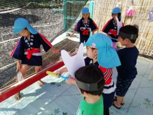 そこから年長さんは、なつまつりで射的屋さんを開店し、盛り上がっていました。