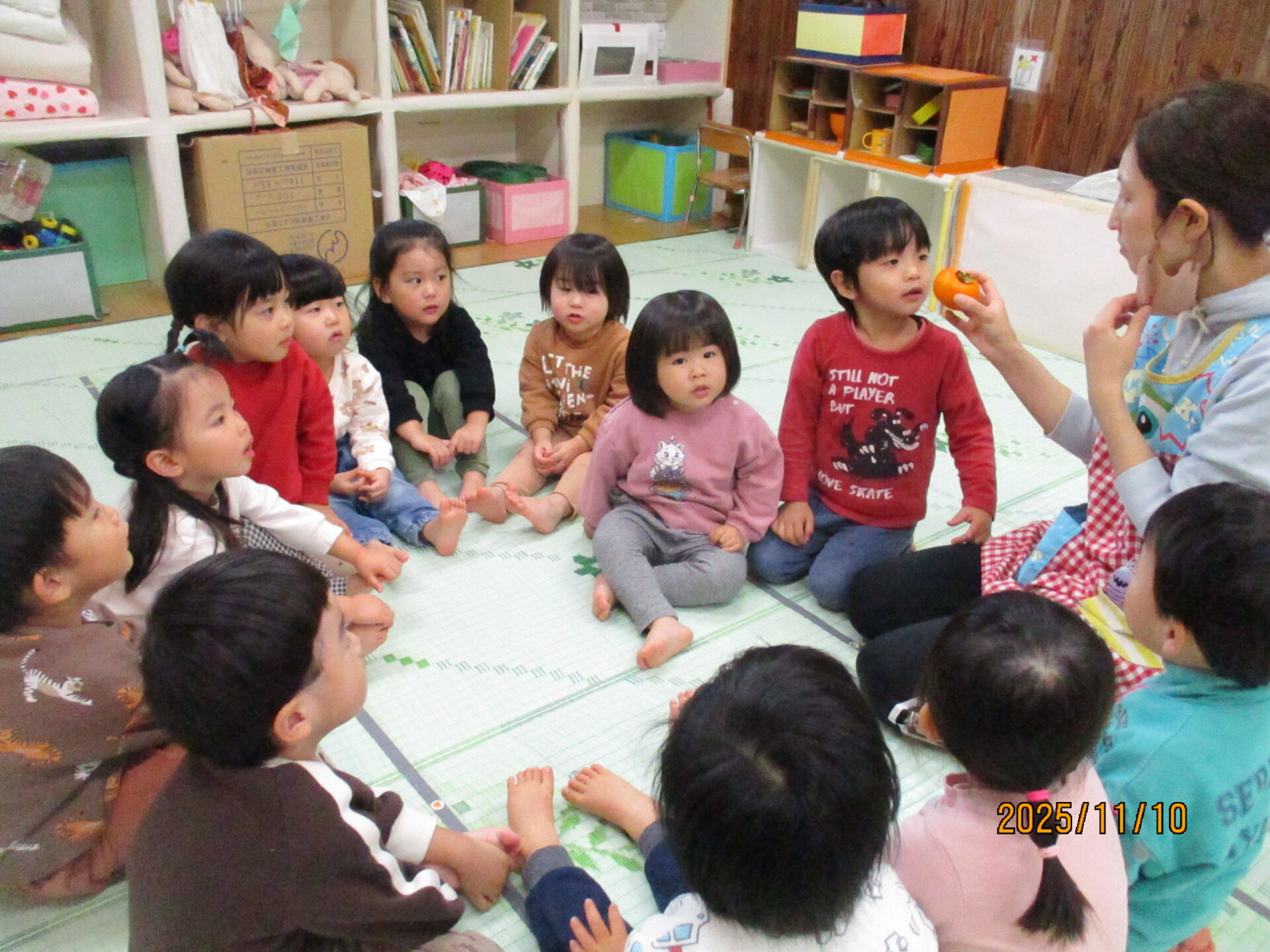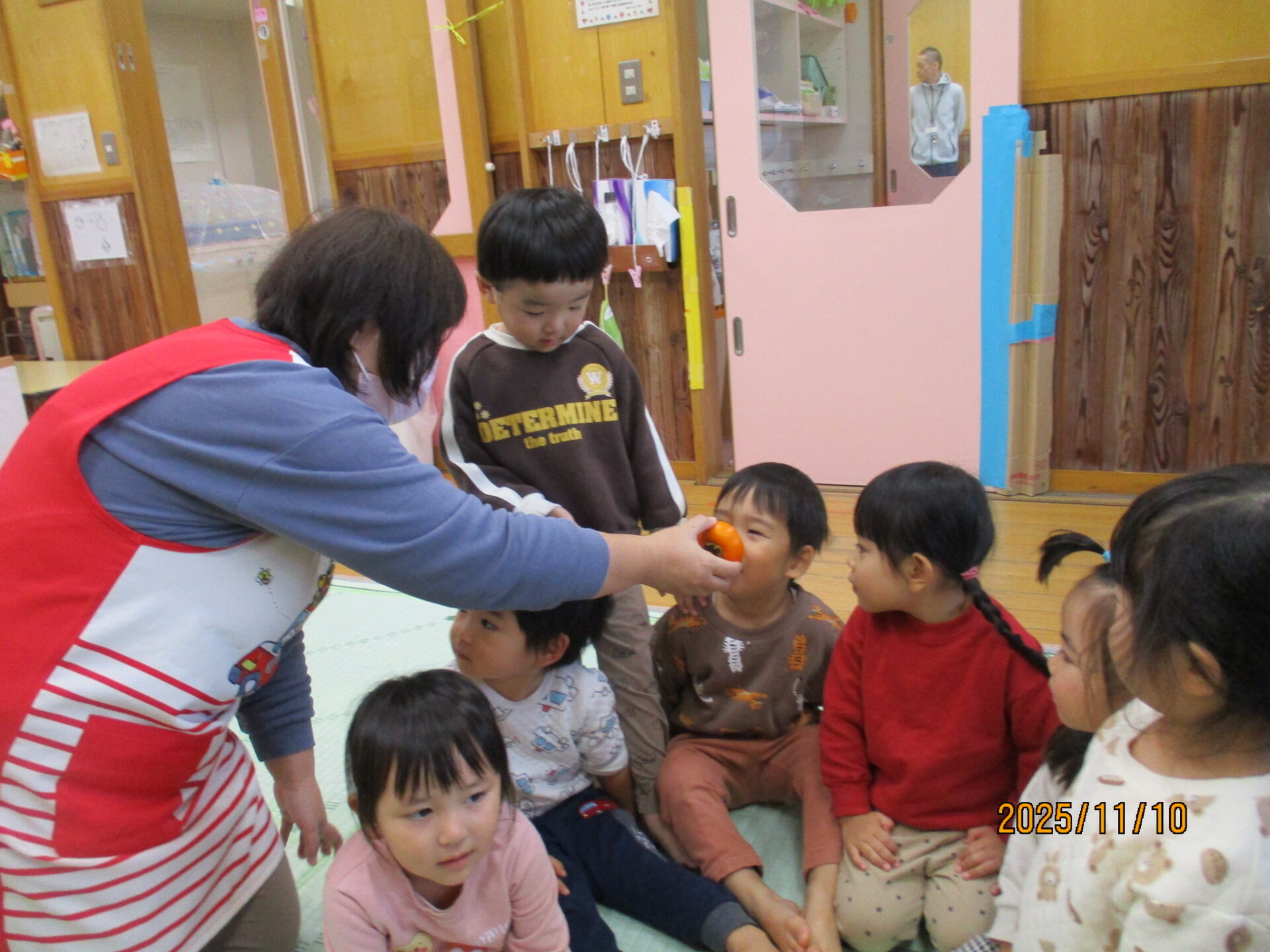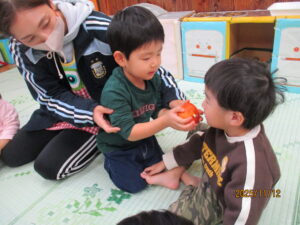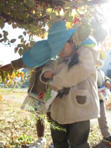 Dちゃん(柿のへたを触って)「痛い!チクチクしてる。」