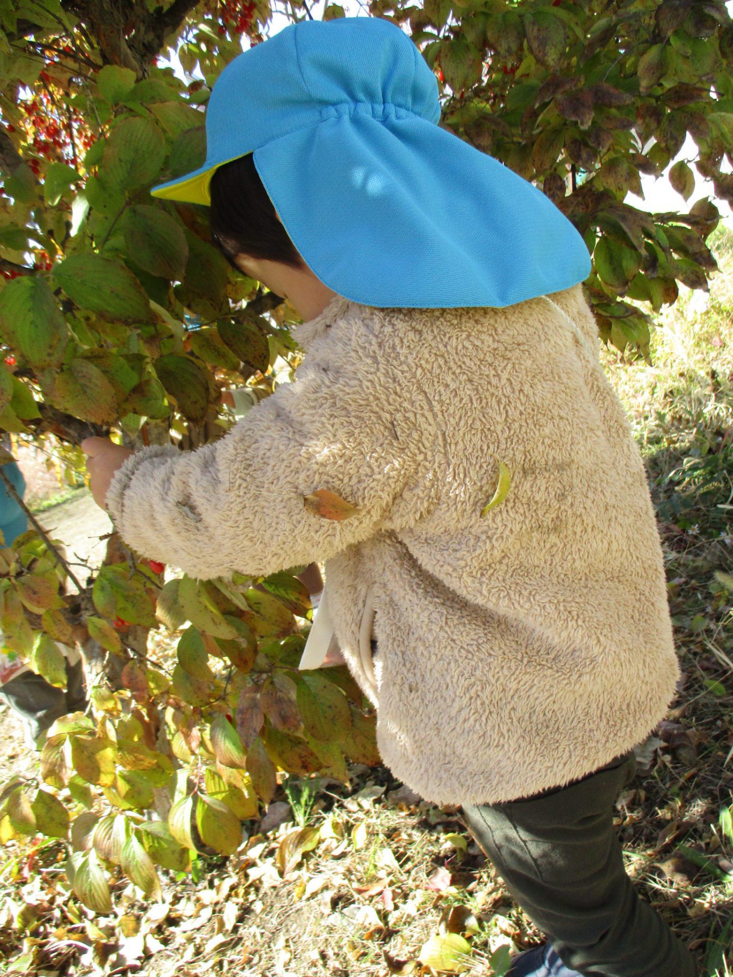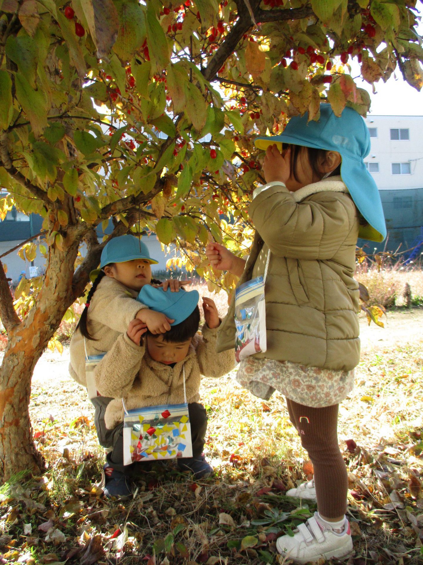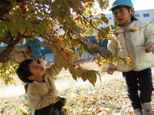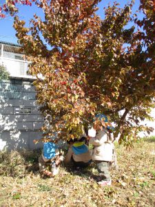 園庭に柿の木があるのを見つけ、「柿あった!」「食べていいの?」と興味津々の子どもたち。