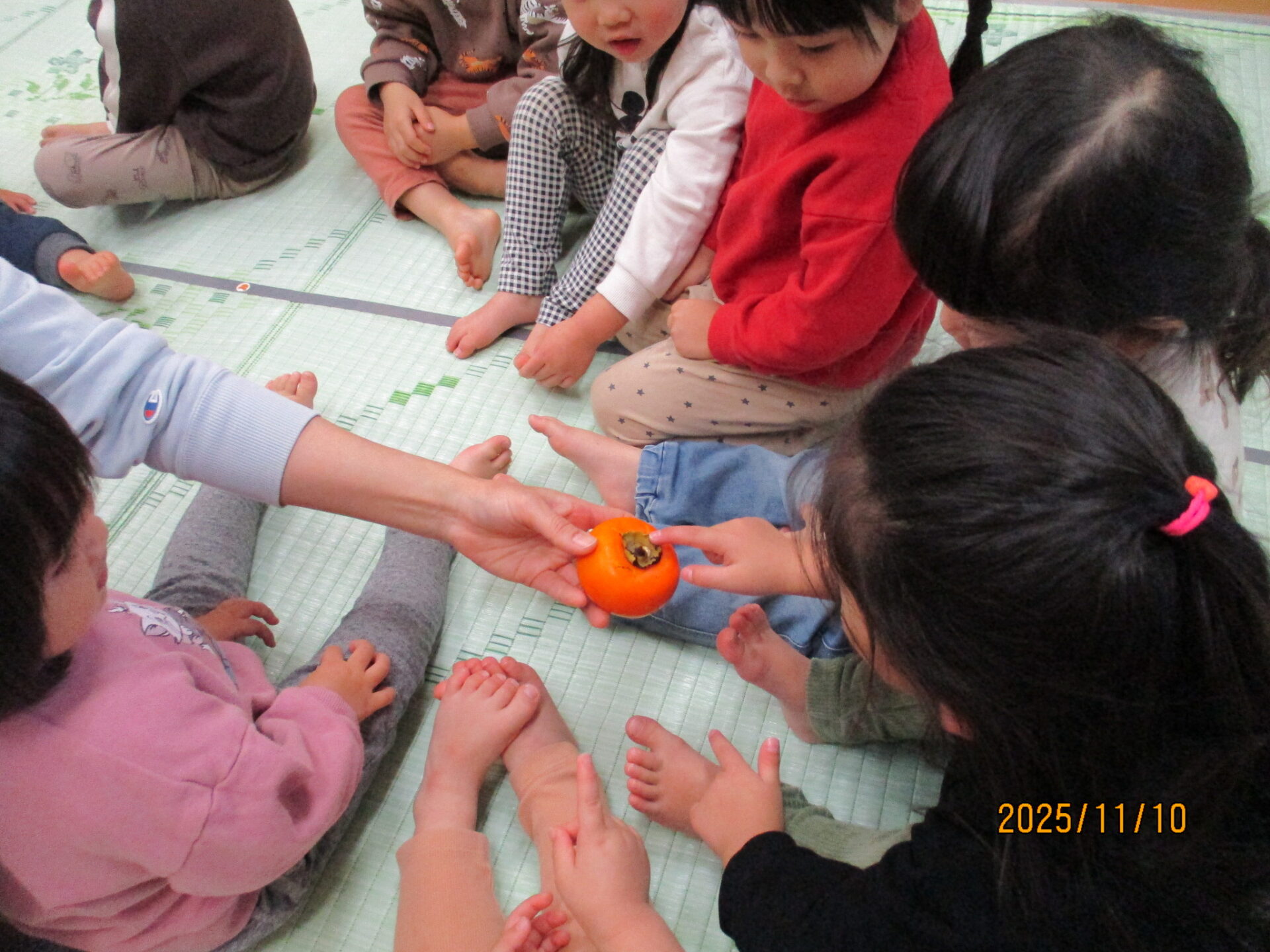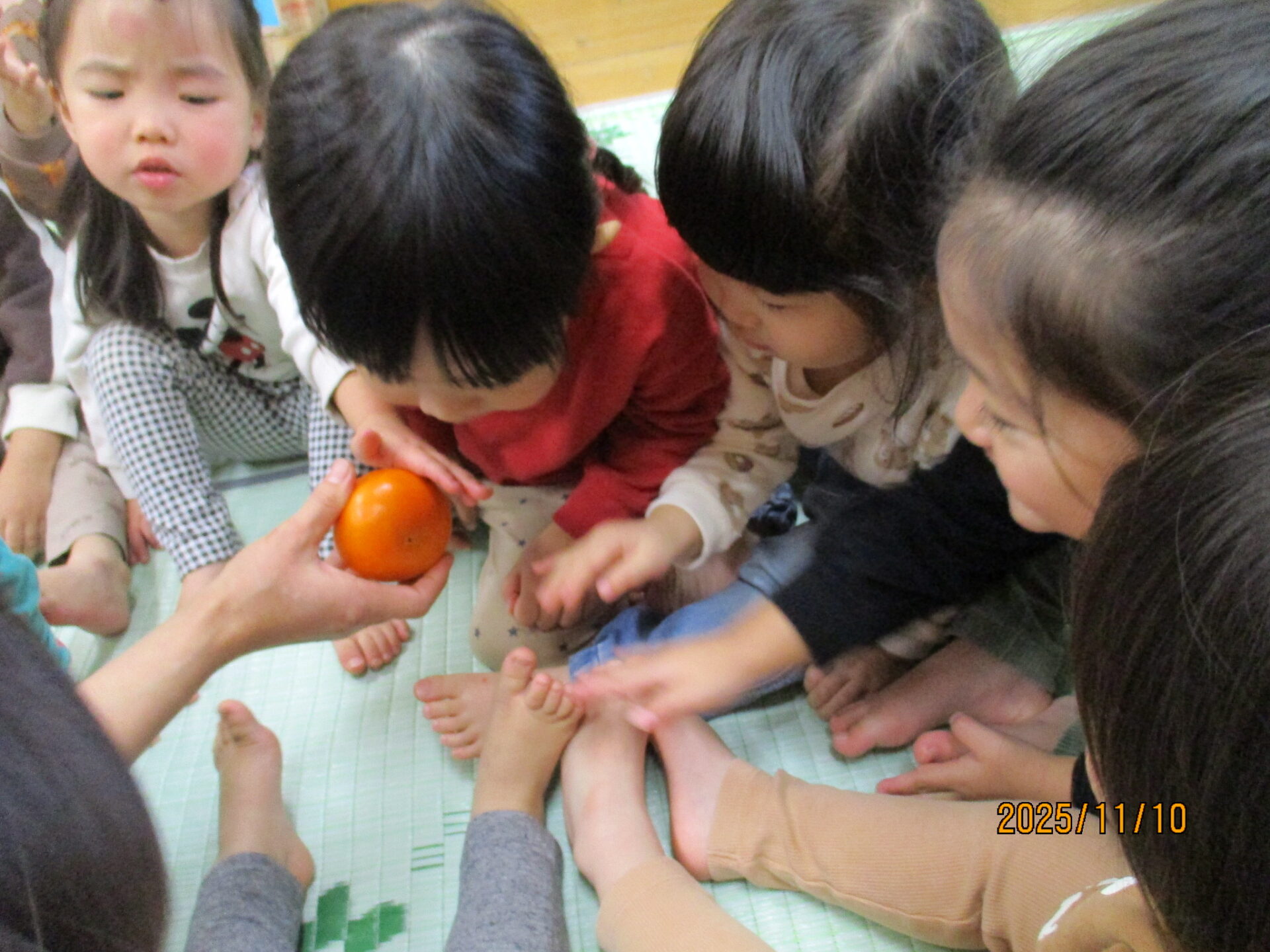 Eちゃん(柿の側面を触って)「さわさわする!さらさらもするよ。」