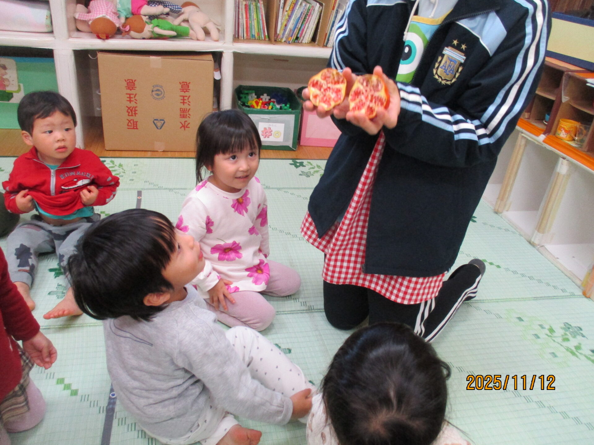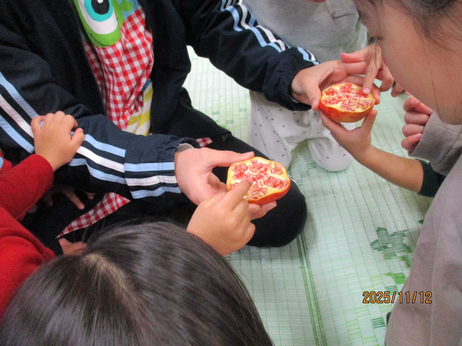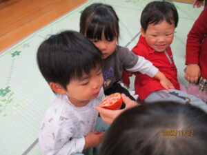 ・ザクロは子どもたちに馴染みのない果物でしたが、じっくり見て、触って、匂いを嗅いでという体験を通して「ザクロ」という名前もすぐに覚え、散歩しながらも「あれは柿だね」「あれはザクロだ!」と違いに気付いたりしていたことに驚きました。