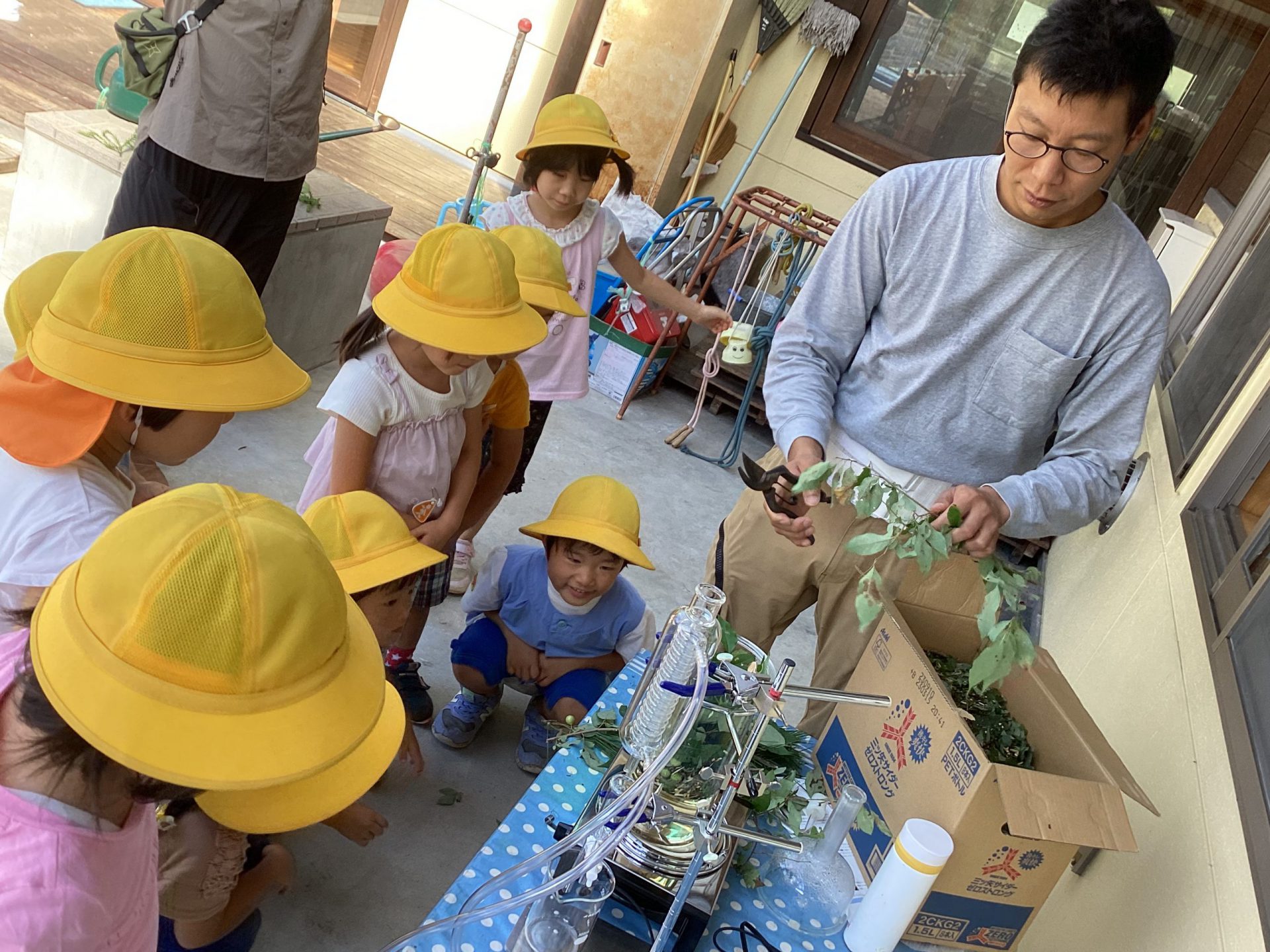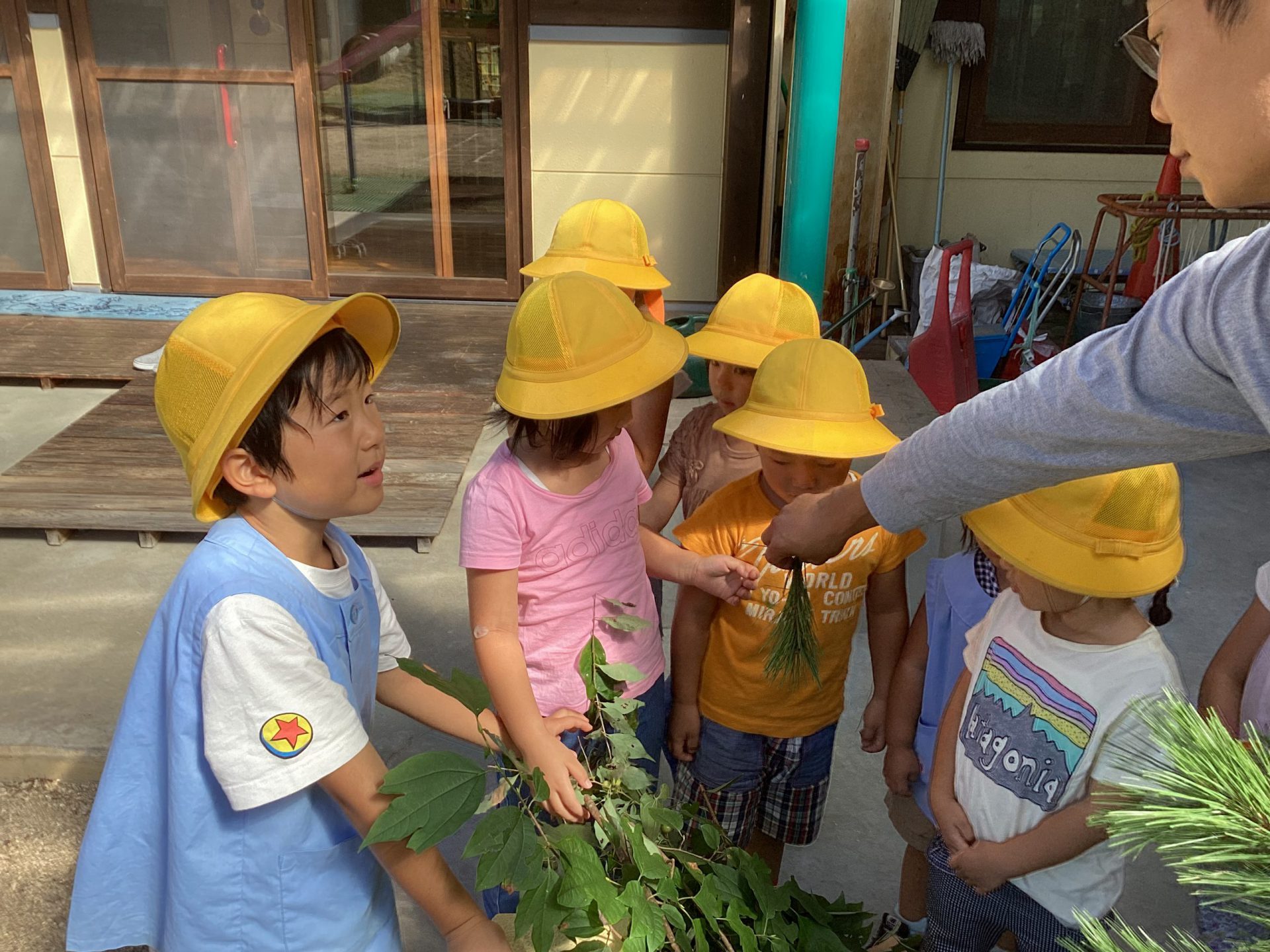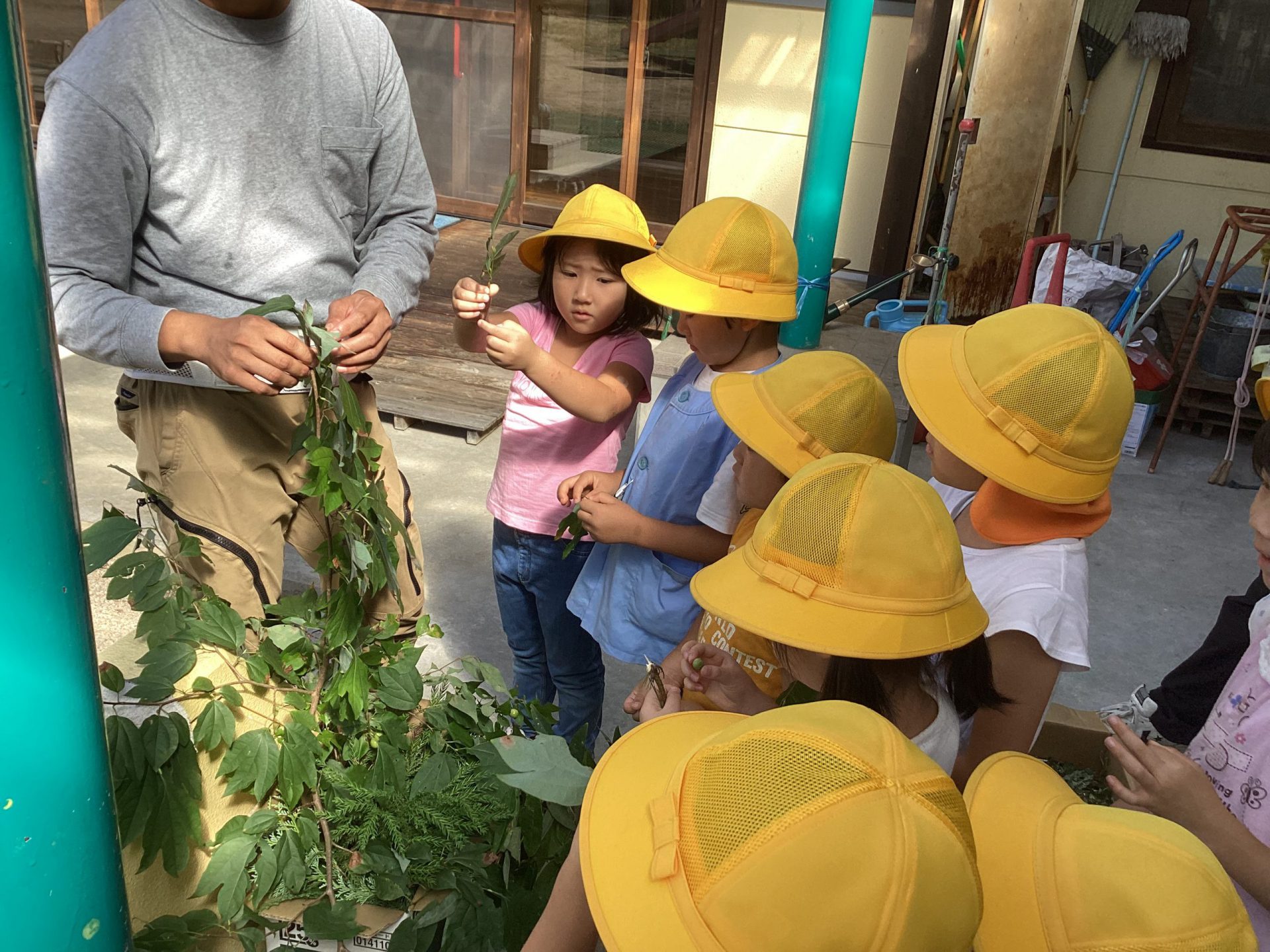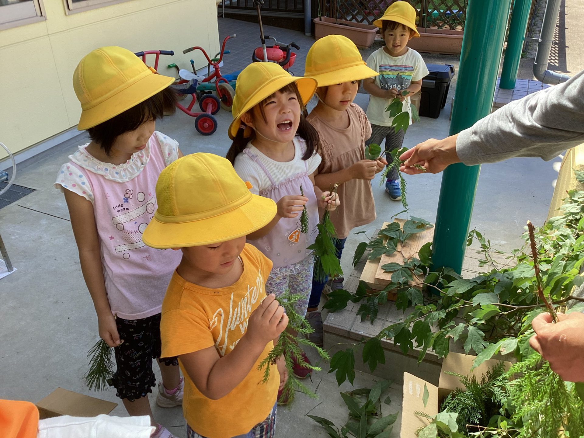 保育士 「収穫したキノコは給食に出してもらえるよう、給食の先生に話をしてみようか?」
