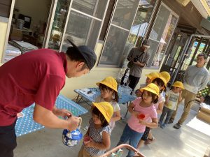 幸山さんがひよこを何羽か小屋から出してくれて、触らせてくれました。ひよこを触っている時は大きな声を出してびっくりさせることのない様に小さな声でしゃべる子ども達。