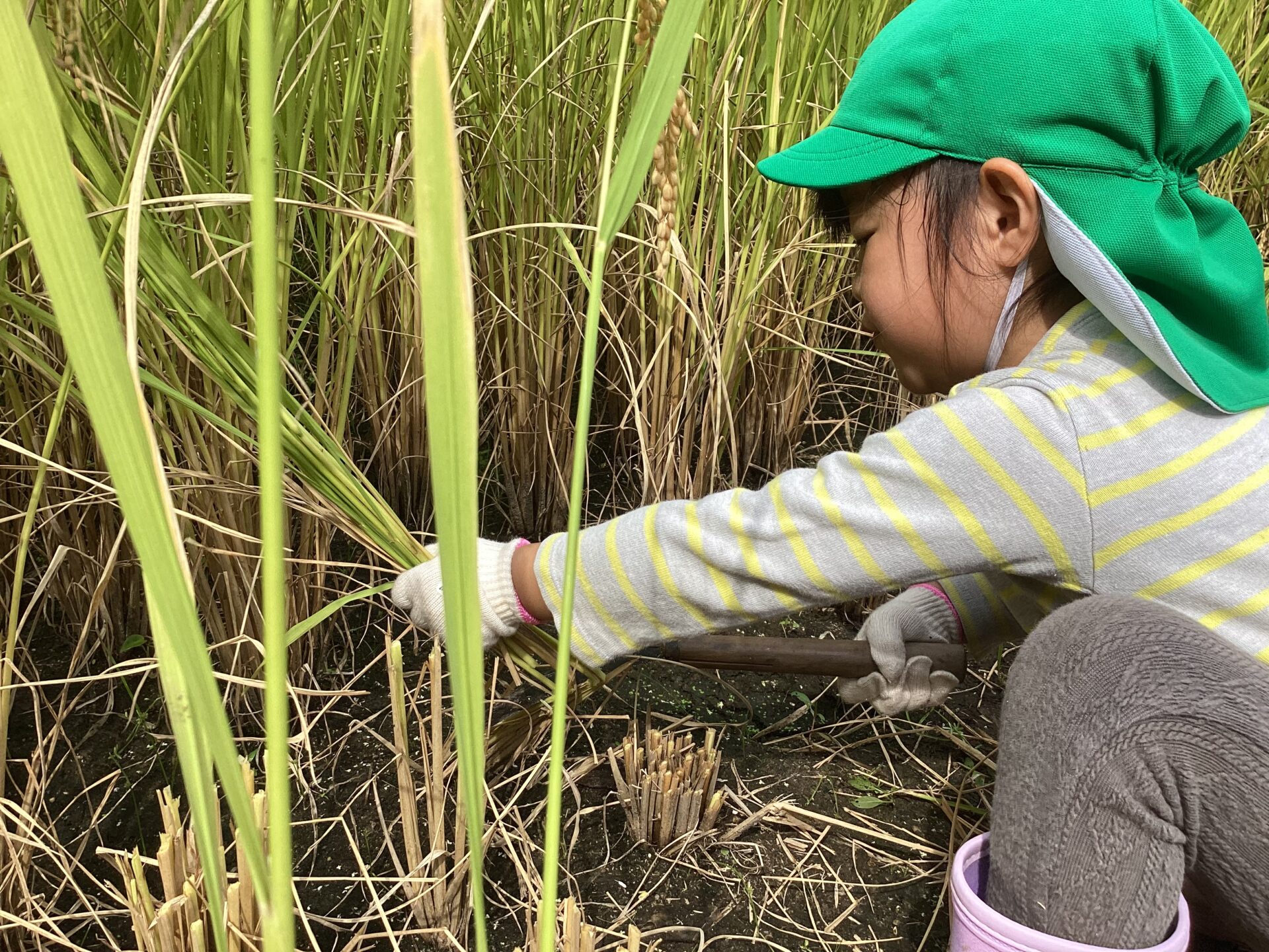 稲刈りを行ったのは、残暑が残る9月でしたが、当日は稲刈りに丁度いい天気で良かったです。稲刈りが終わって、給食中や、給食後、刈った稲が食べられる様になるまで、どんな作業があるのか、ずっと気になって喋っている子もいて、とても関心が高い様子が伺えました。泥遊びや田植えの体験では、あまり関心が無かった子もいましたが、今回の稲刈りは全員が夢中になれた体験で、みんなの達成感が感じられた活動でした。また、刃物を扱うということで、初めて経験する子も多数だった為、スタッフの方が沢山来てくれたことで子ども達全員に目が行き届き、安全に楽しめました。みんなで田植えをし、稲刈りをしたお米をいただく時に子ども達がどんな反応をするか、とても楽しみです。