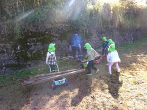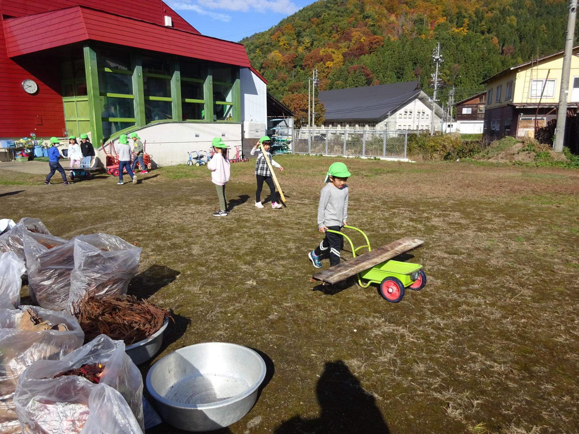 年長児さんがやきいもの準備で、、、みんなで「ワッショイ!!」お友達と力を合わせることって楽しい♪