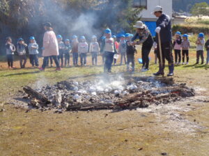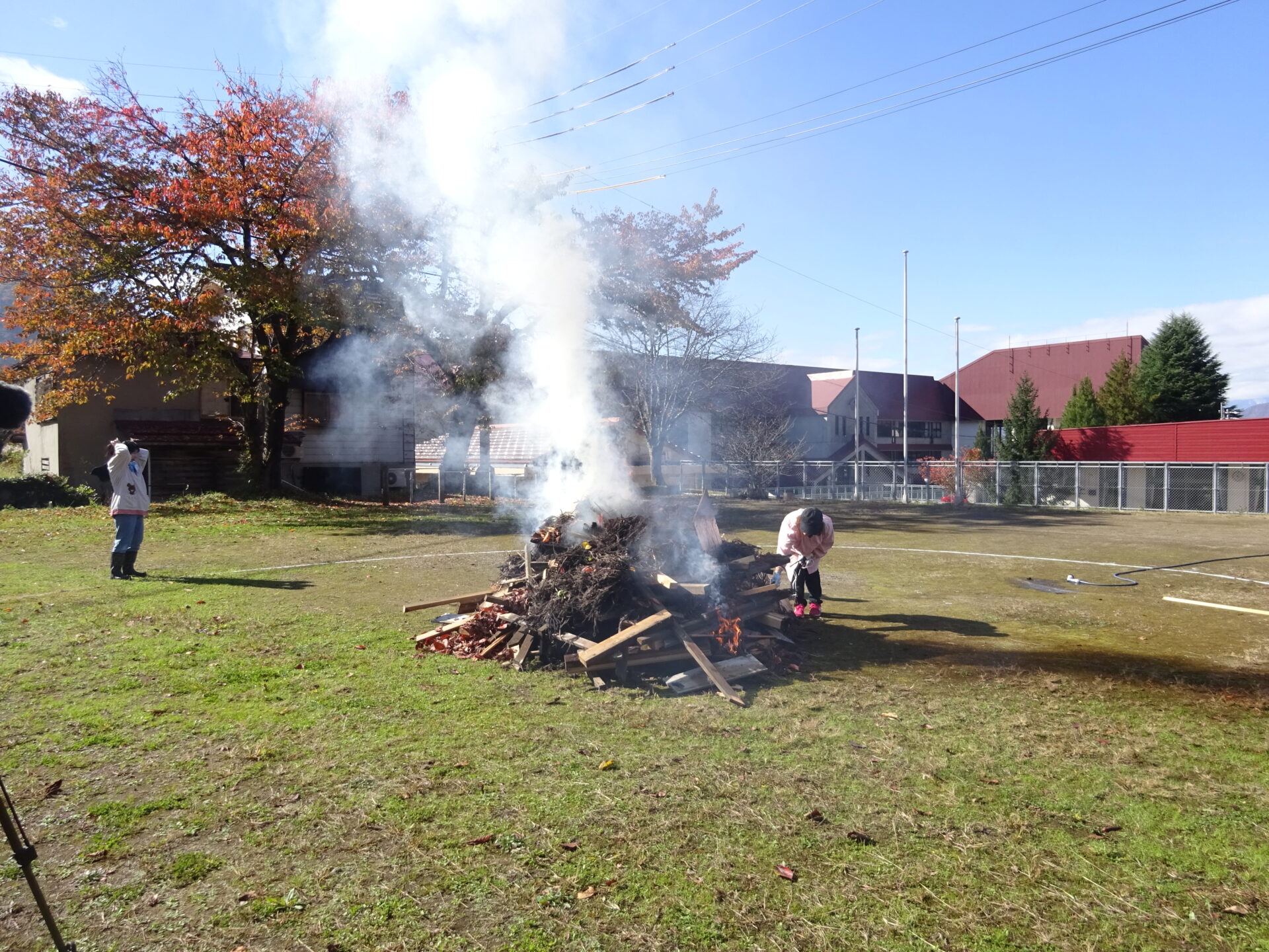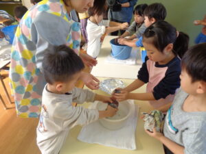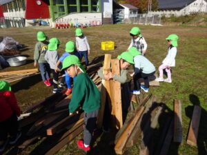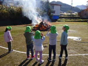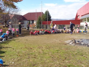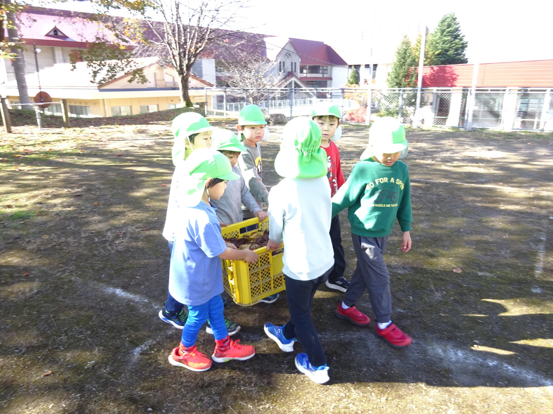 毎年この時期に行っている『やきいも大会』ですが、年長児は火たきの準備、年中児はいもの準備、年少児は落ち葉ひろいのお手伝いと、各年齢によるお仕事があります。