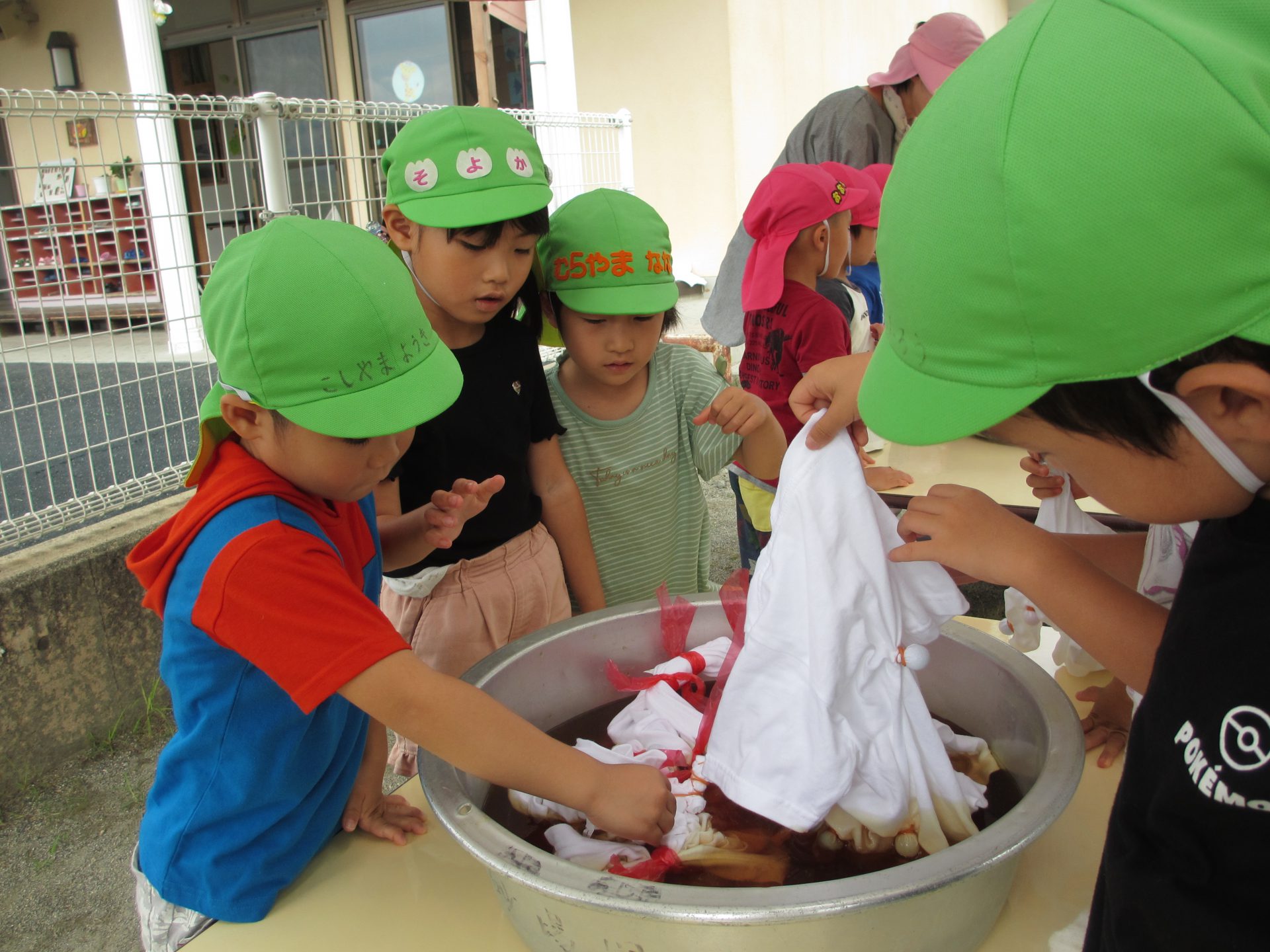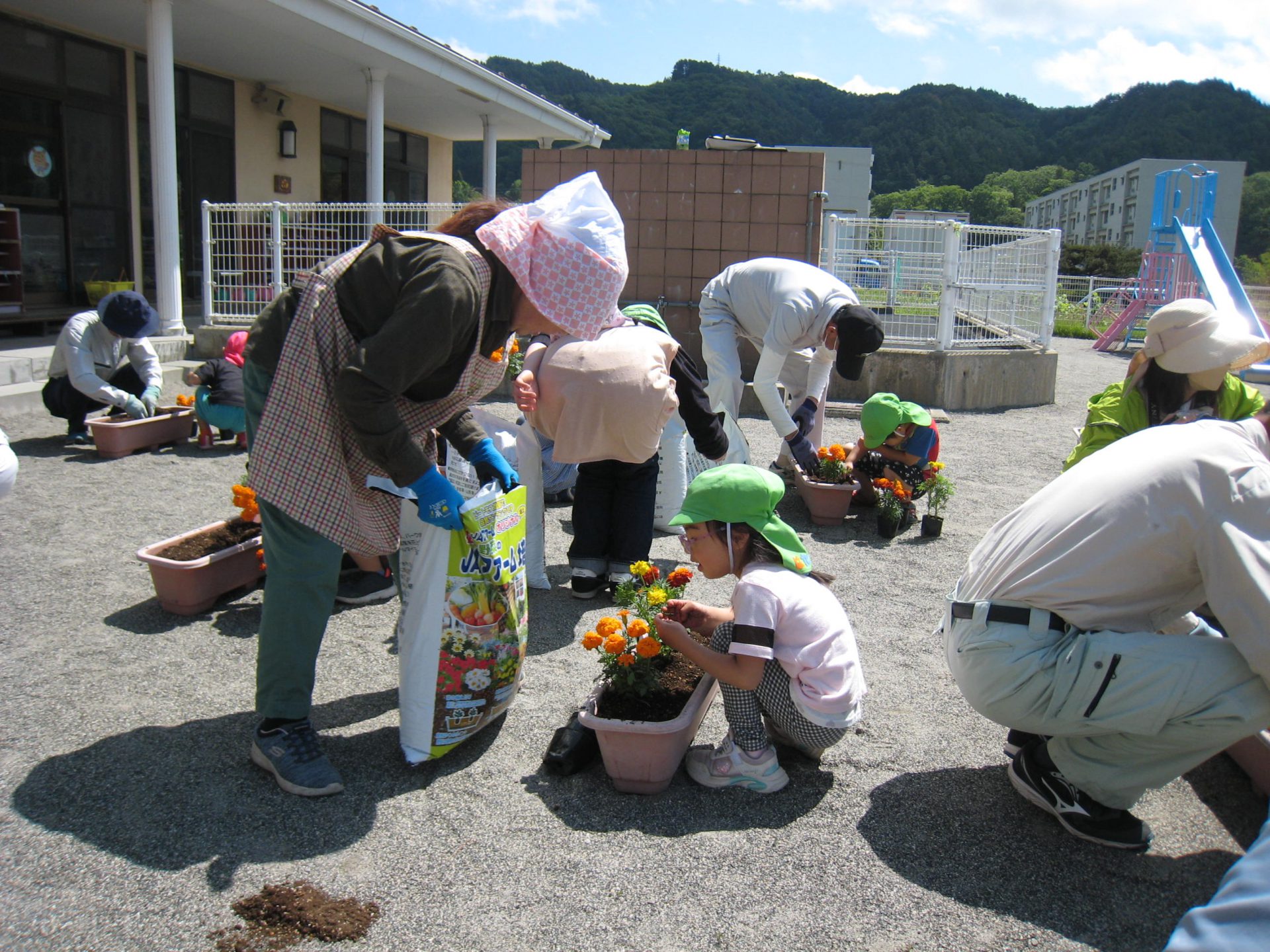 地域の方に教えてもらいながら、田植えをしました。「これがお米の赤ちゃんだよ」と聞いて、「え!」「大きくなるの?」と稲を観察。ちょっとずつちぎってさしていくことを聞き、田植えがスタートしました。「あしが!」と、転んだりしながら植えました。