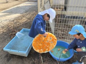 毎日氷遊びを楽しんでいたところ、年長さんから給食で出たみかんを見て「みかんの皮凍らせたら氷はオレンジ色になるかな?」と。